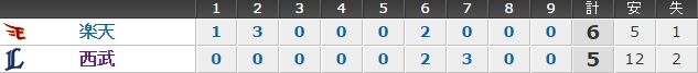楽天逃げ切る=プロ野球・西武―楽天楽天が逃げ切った。松井稼の先頭打者本塁打や阿部の適時打などで二回までに4点先行。七回に1点差に迫られたが、福山らが好救援した。六回途中まで投げた新人浜矢が初登板初勝利。西武は先発誠の制球難と前半の拙攻が響いた。