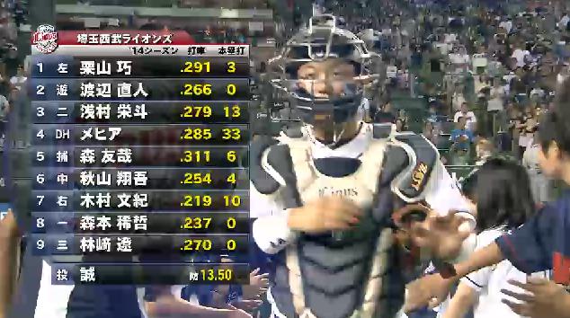 昨日足を負傷した中村に代わり4番メヒア、5番に森本、9番サードに林崎が入りました。