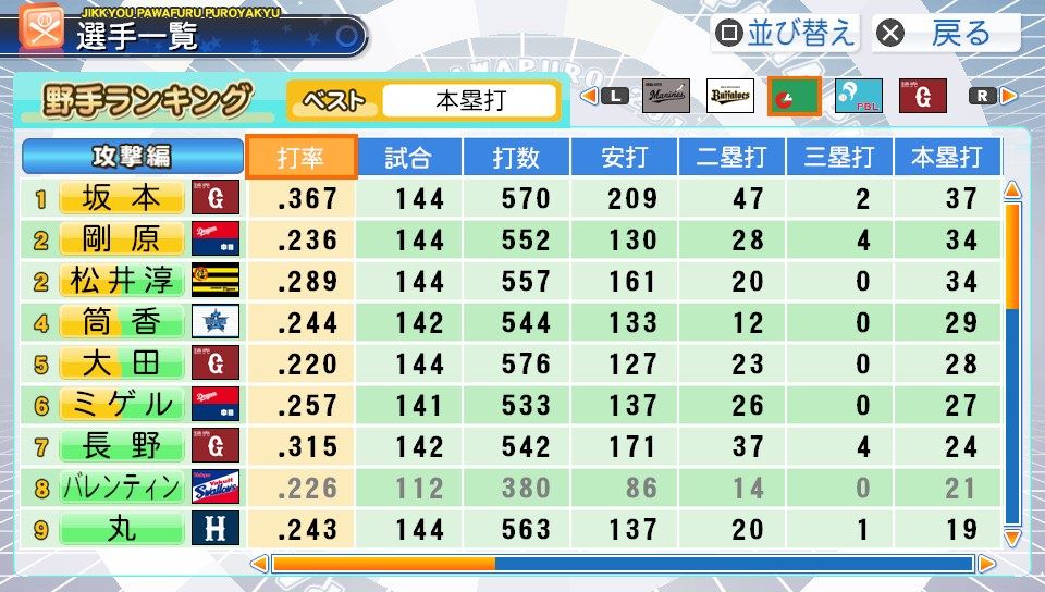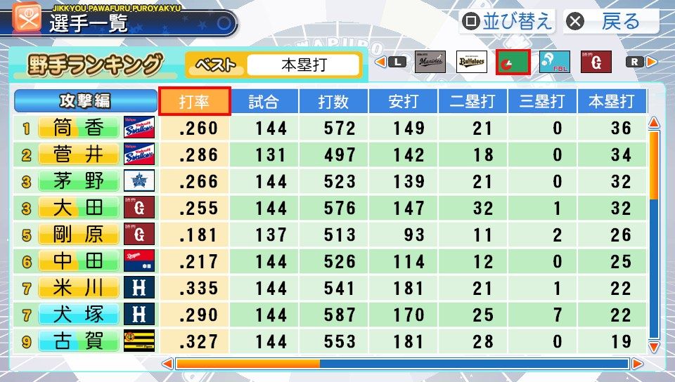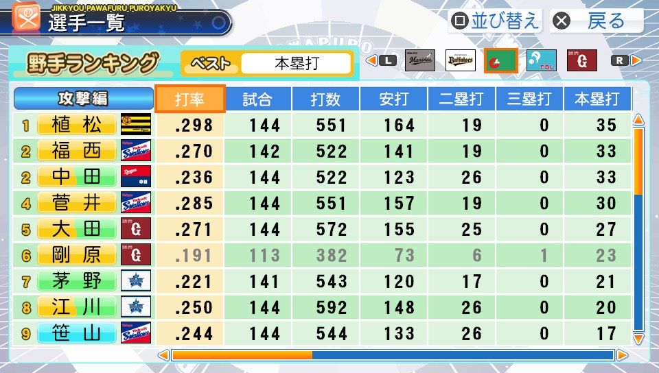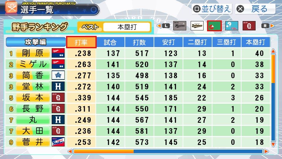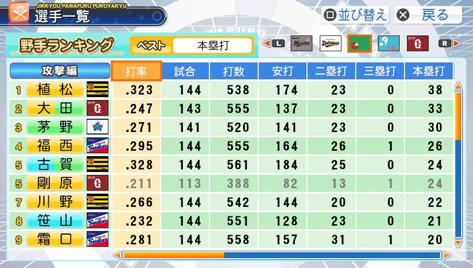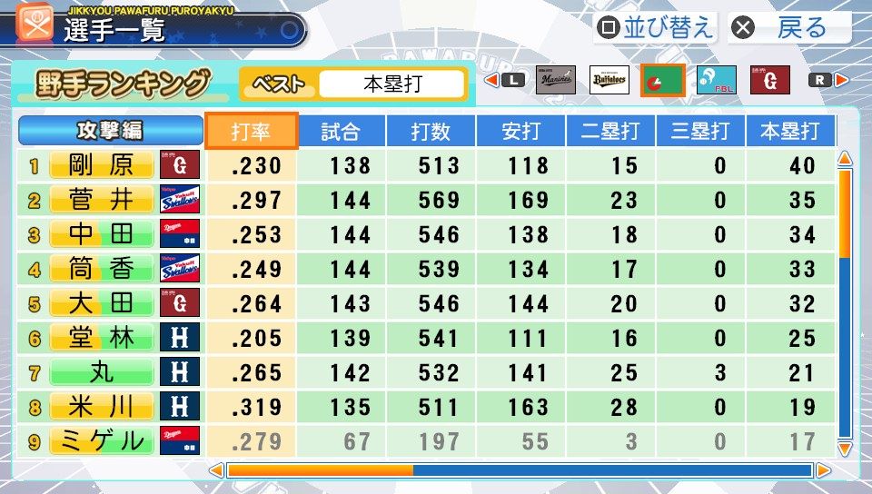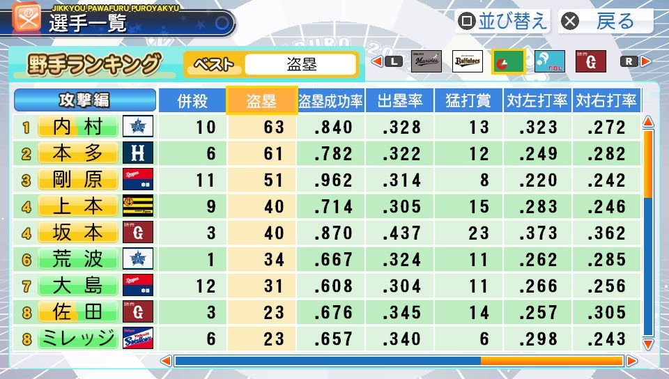 弾4FAAFFG 盗塁5 プルヒッター 内野安打○ ヘッスラ