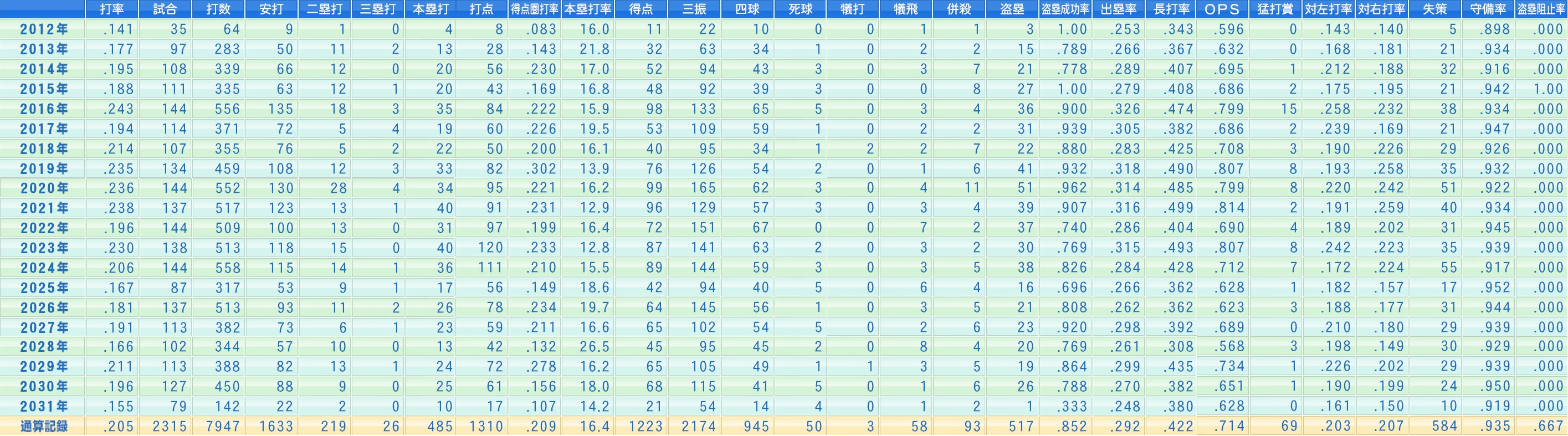 三振94 四球43 死球3 出塁率.289 長打率.407 OPS.695