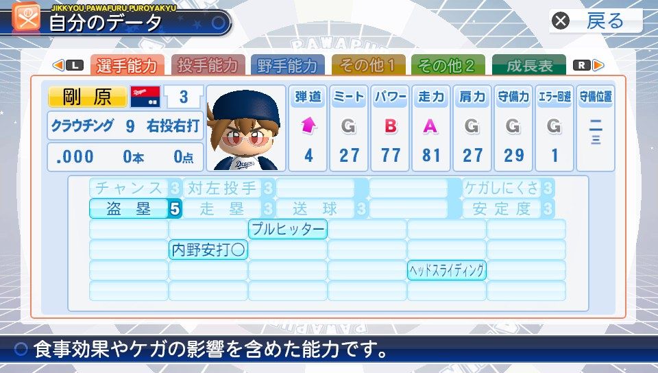 弾4GCCGGG 盗塁5 走塁2 プルヒッター 代打○ 内野安打○ ヘッスラ PH 三振