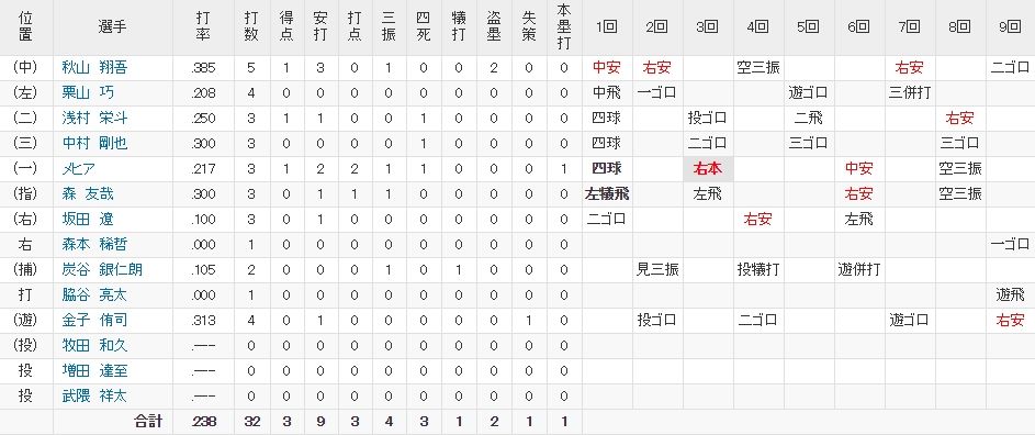 秋山が2回盗塁決めたりメヒアに1発が出たり、金子の守備が冴えていたりと