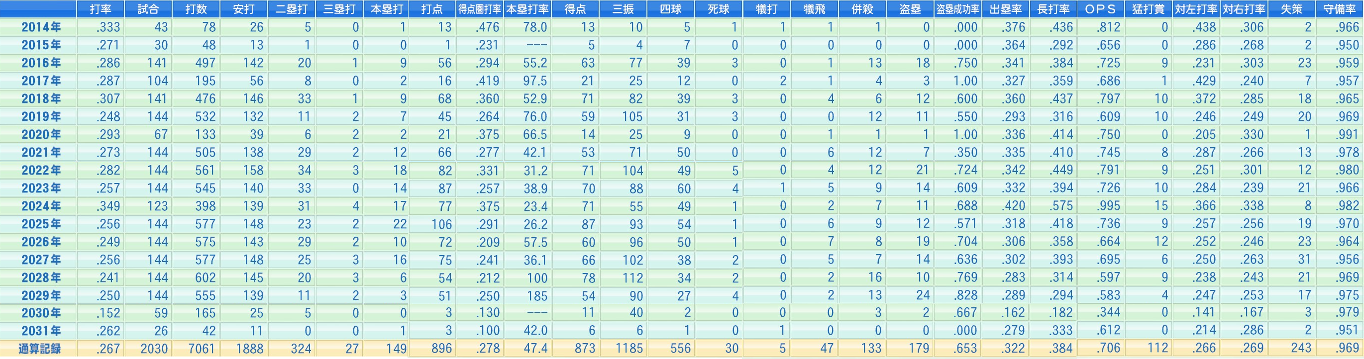 2030試合 .267(7061打数1888安打) 149本 896打点 得点圏.278 179盗塁(成功率.653)