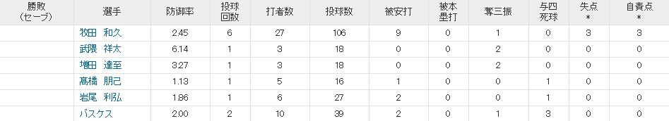 7回から登板したリリーフ陣は不安定ながらもよく頑張ってくれました。特に岩尾は良い経験を積めたはず。頼むから次はすんなり抑えてくれ。
