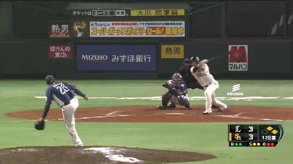 ソフトB延長12回無死満塁生かせず、西武とドロー西武は1回、秋山の2号ソロで先制。その裏、ソフトバンクに逆転を許したが、3回に浅村、中村の適時打で逆転した。ソフトバンクは6回に李大浩、松田、明石の3連打で同点に追いついた。先発中田は4回に得点圏に走者を背負うも切り抜けた。終盤に入ると両チームの救援陣が無失点でしのぎ、延長戦に突入した。ソフトバンクは12回裏に無死満塁の好機も無得点だった。試合は3-3の引き分けに終わった。