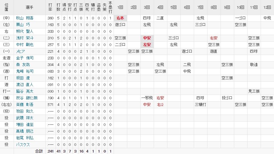浅村がいい感じに繋いでくれてる…にしても延長とはいえ三振多いですね…