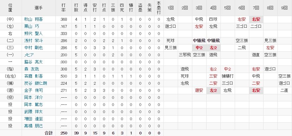 下位打線に動きがあるとイイね、浅村は打点王目指して引き続きこの形で繋いでくれ