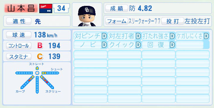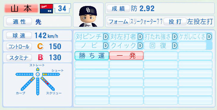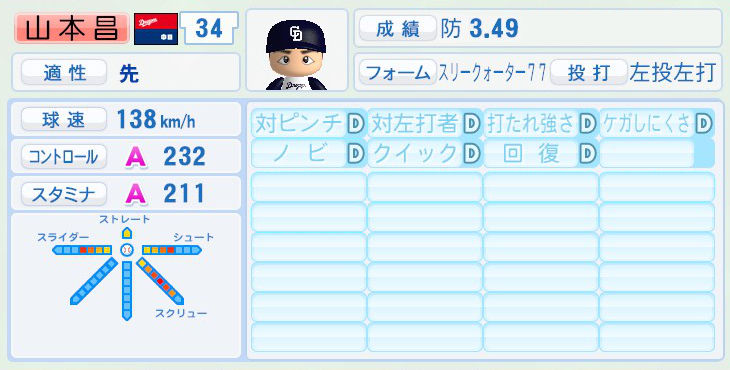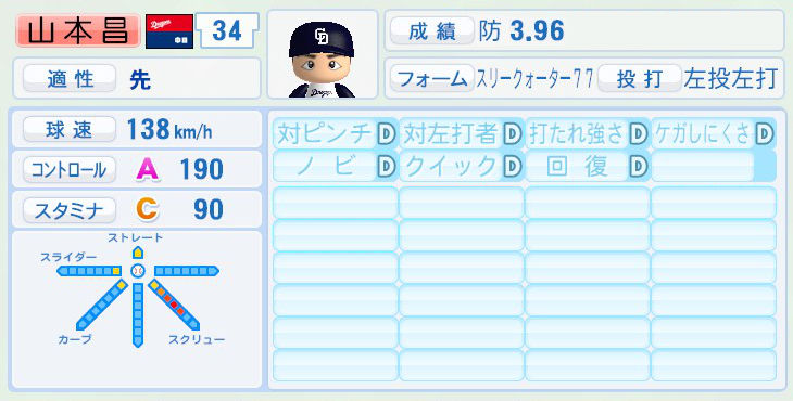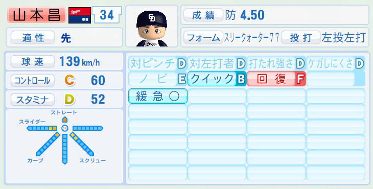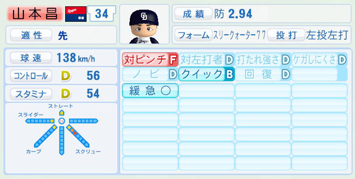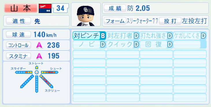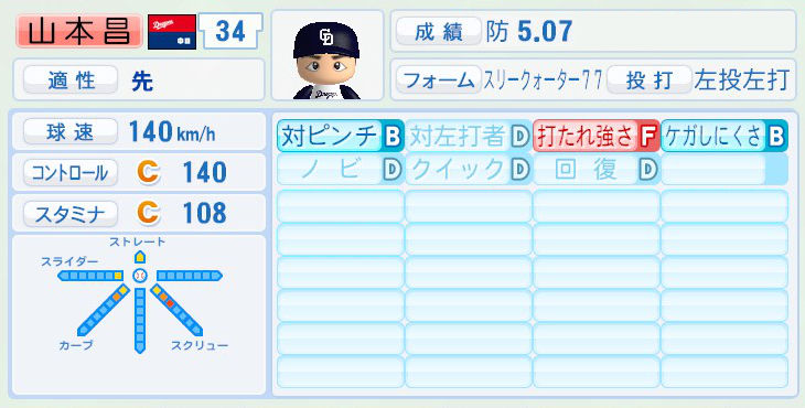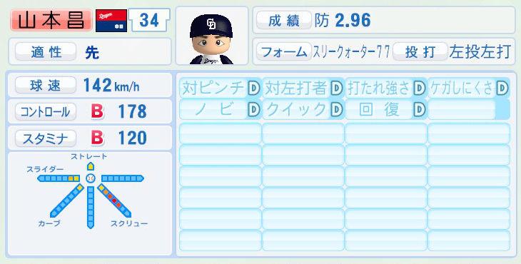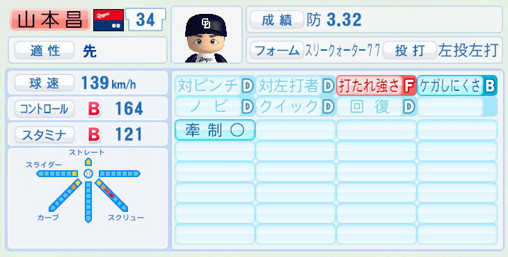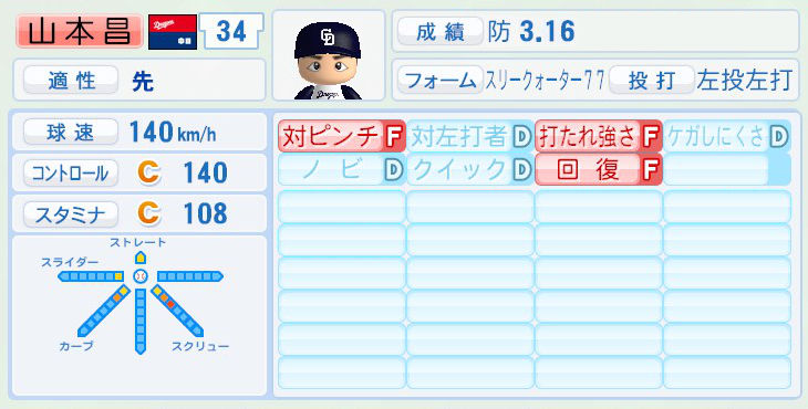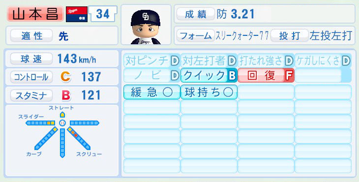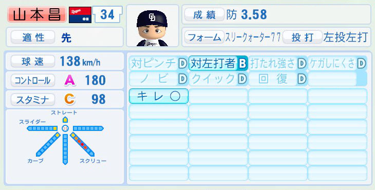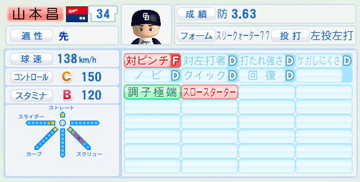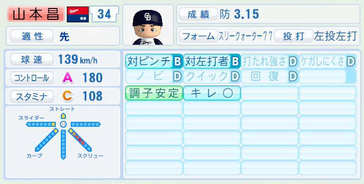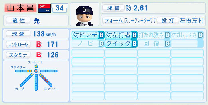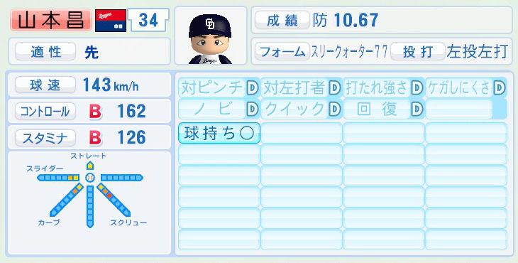 パワプロでは前年まで持ち球であったシュートが消えて変わりにスライダーを習得。