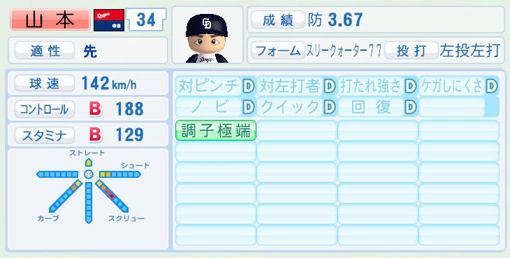 球速は僅かに低下したが、そのほかの基本能力は前年からあまり変化が無い。
