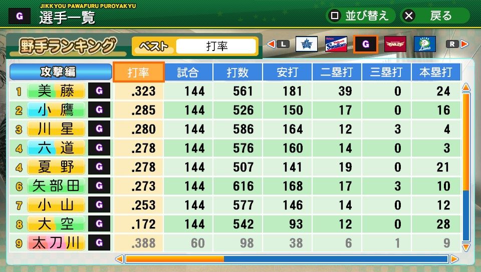 美藤(右) 144試合  .323(561-181) 24本 86打点 2盗塁(.500) 犠打0 四球67