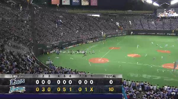 日本ハム3連勝、西武は今季ワースト4連敗日本ハムは2回に大野の三塁への打球が失策を誘い2点を先制。この回に3点を奪った。先発メンドーサは3回まで完全の快投。日本ハムは5回にレアードの15号3ランなどで一挙5点を追加。西武は先発菊池が4回2/3、6失点(自責は4)で降板した。日本ハムは大量10点を奪い同一カード3連勝。先発メンドーサは5勝目。西武は今季ワースト4連敗で、初の同一カード3連敗。