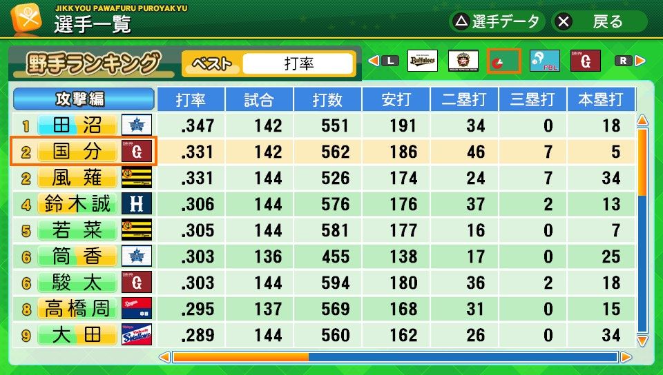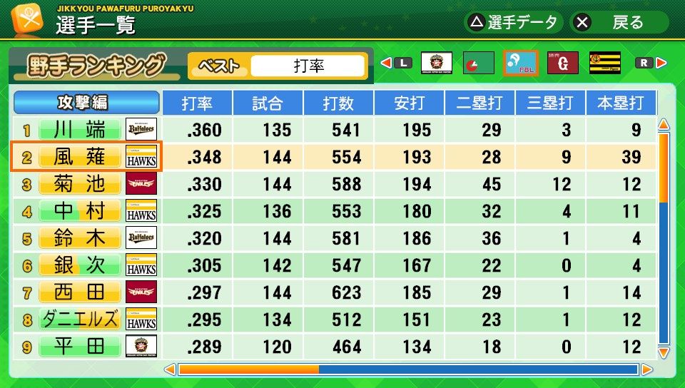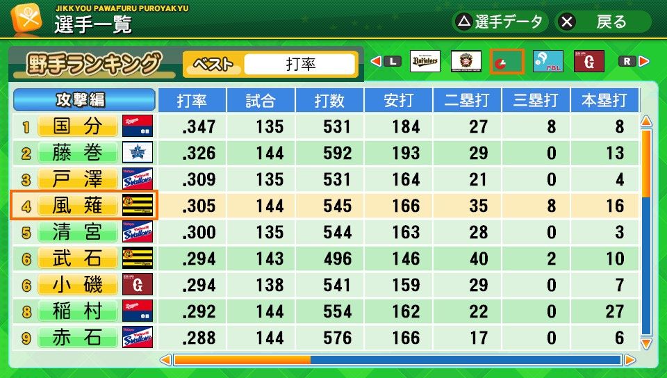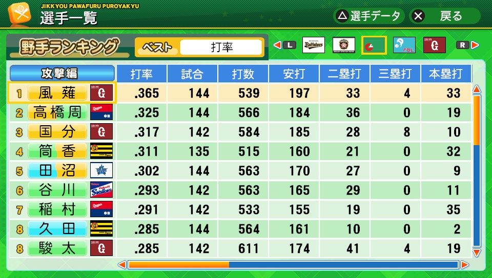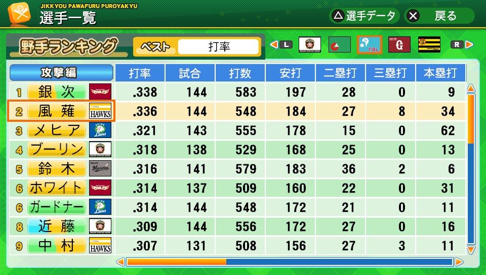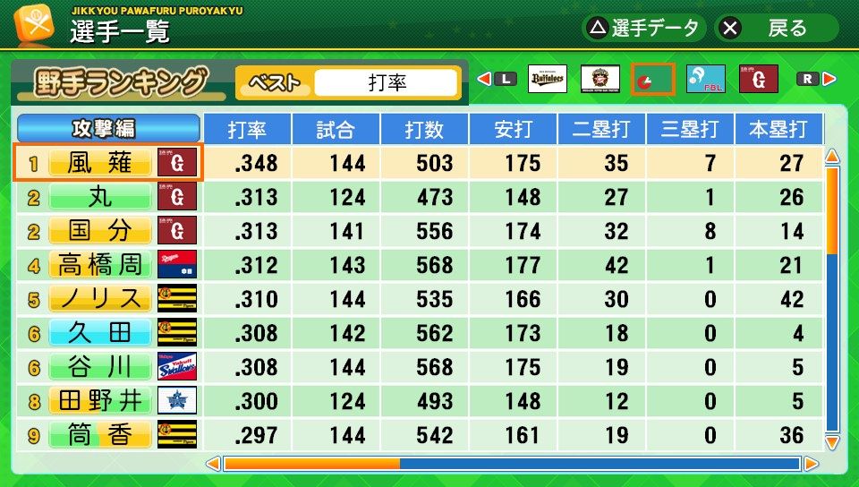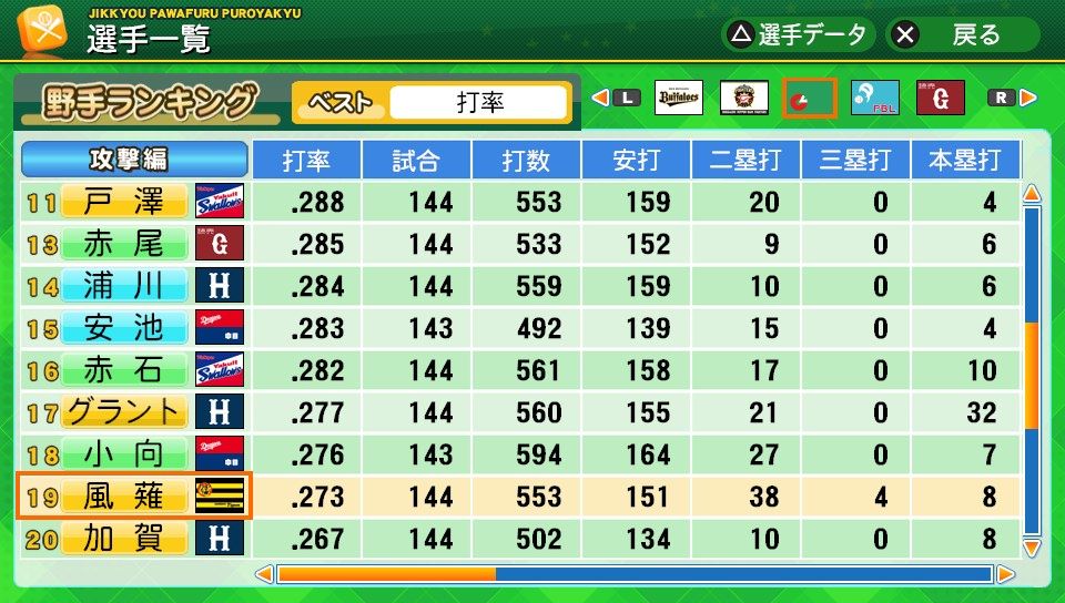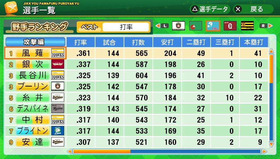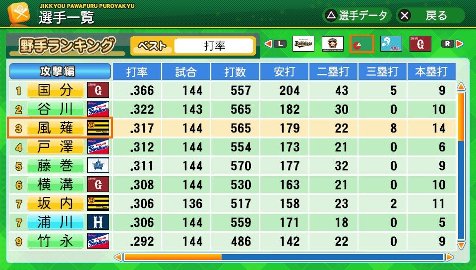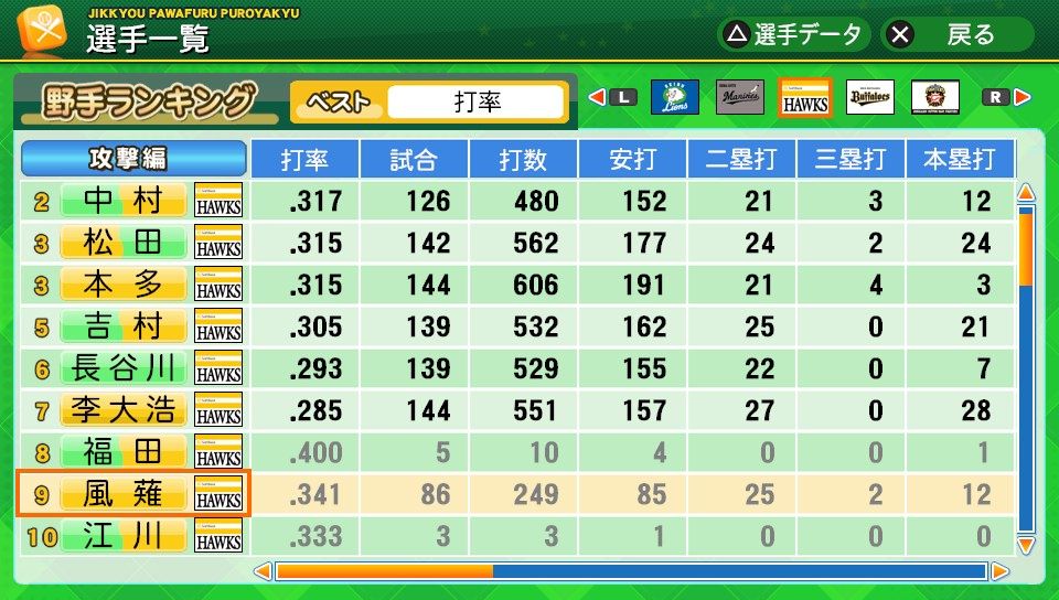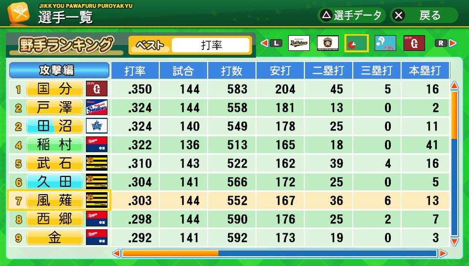 相変わらず初球とか対左とか特能が消えまくりだな