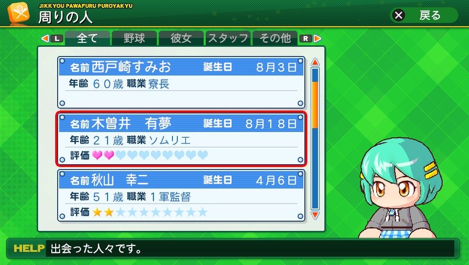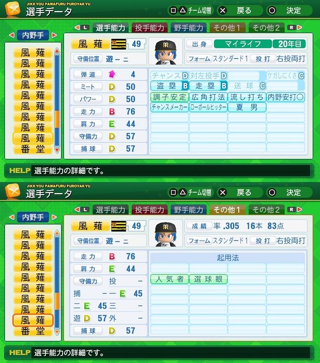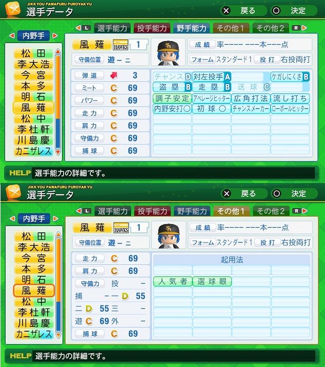 弾4BBBBBB チャンスC 対左B ケガB 盗塁B 走塁A 送球C 調子安定 AH 広角打法