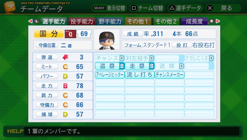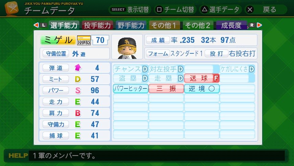 弾4BBBBBB チャンスC 対左C ケガB 盗塁B 走塁A 送球C 調子安定 AH 広角打法