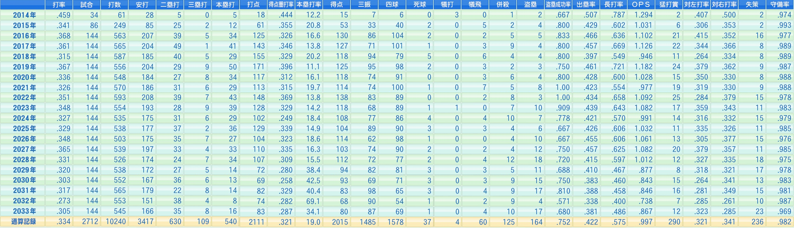 2712試合 .334(10240打数3417安打) 540本 2111打点 得点圏.321 164盗塁(成功率.752)