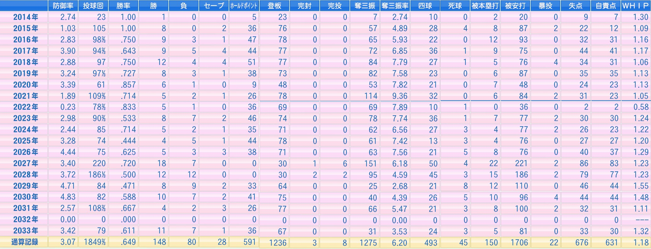 四球493 死球45 被本塁打150 失点676 自責631 WHIP1.18