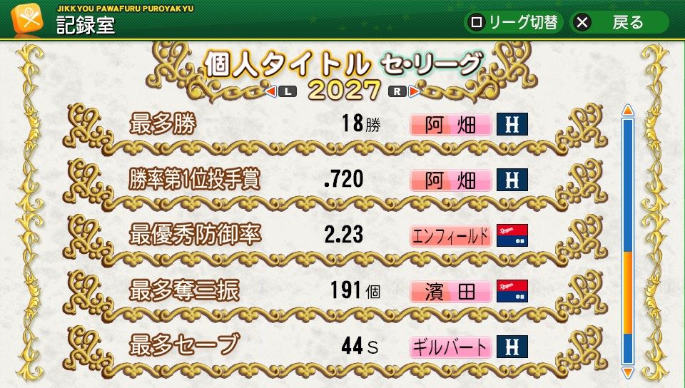 3.90と防御率は少し悪化するも44ホールを挙げる活躍で