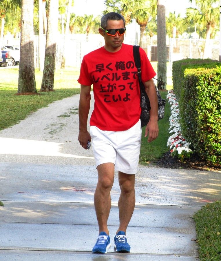 マーリンズのイチロー外野手(42)は、赤地に黒いゴシックの字で「早く俺のレベルまで上がってこいよ」とメッセージ性の強いTシャツを着て球場入りした。