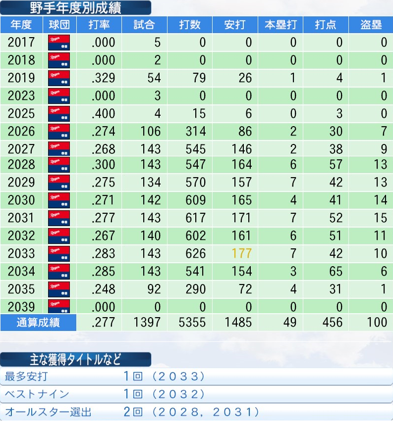 21試合 .158(38打数6安打) 0二塁打 0三塁打 0本塁打 2打点 0盗塁(.000)