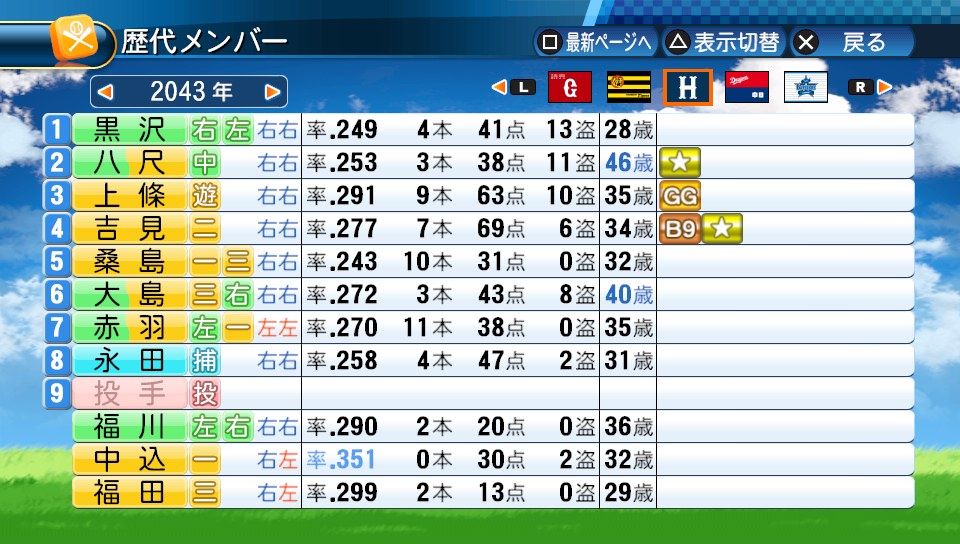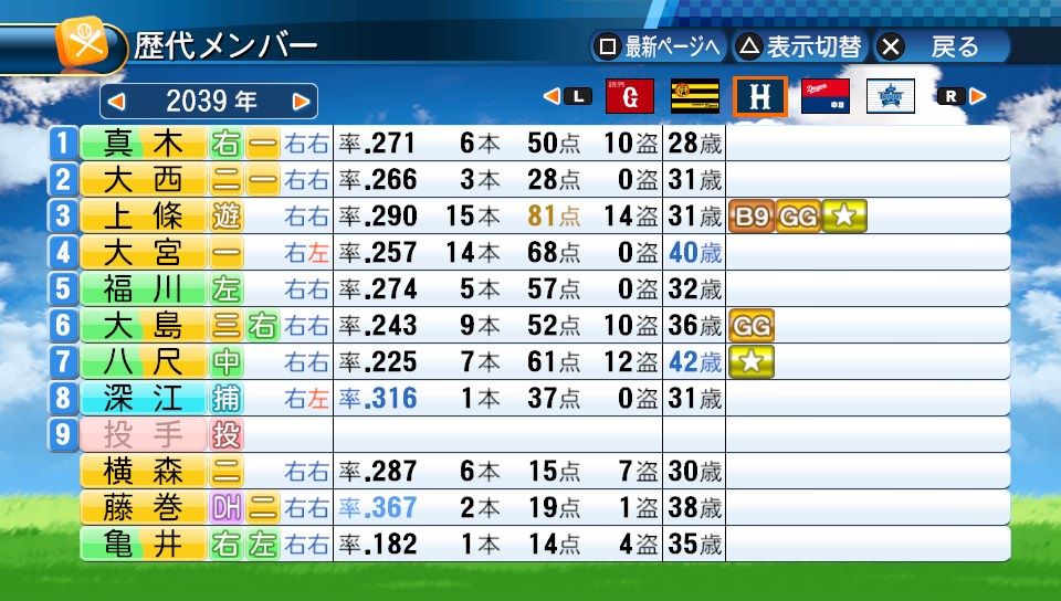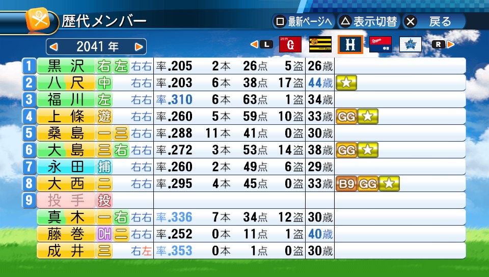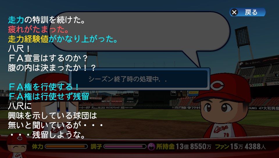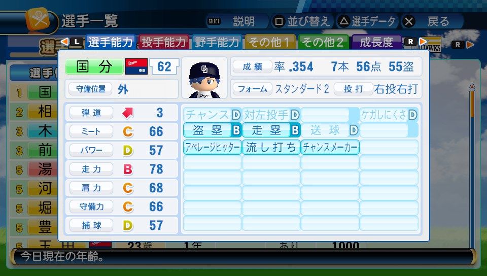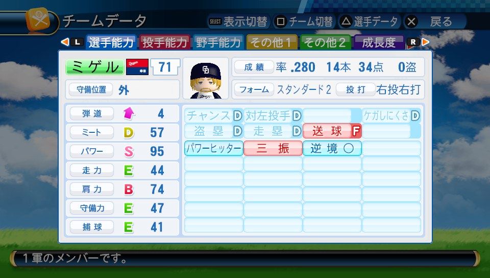 弾3FEBFFF チャンスC ケガG 盗塁F 走塁C 送球F 粘り打ち 内野安打○ 満塁男 秋男