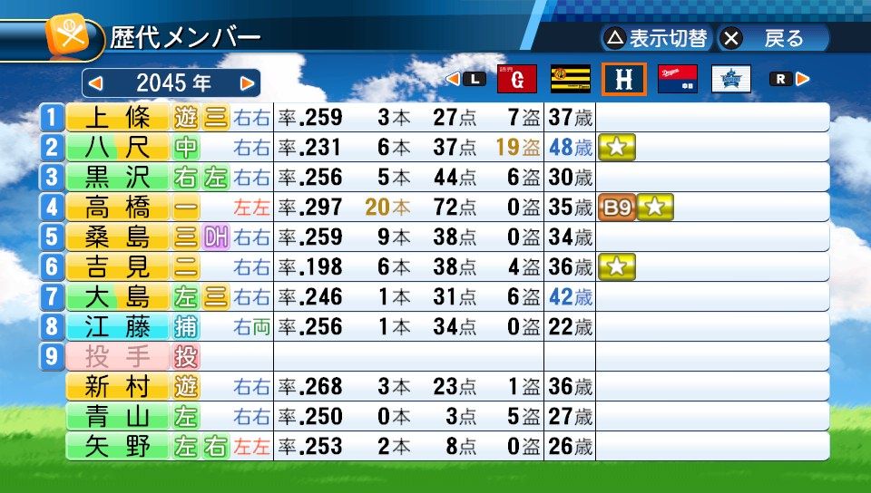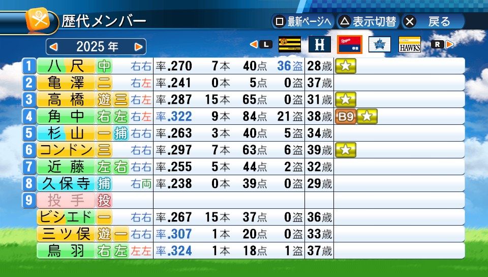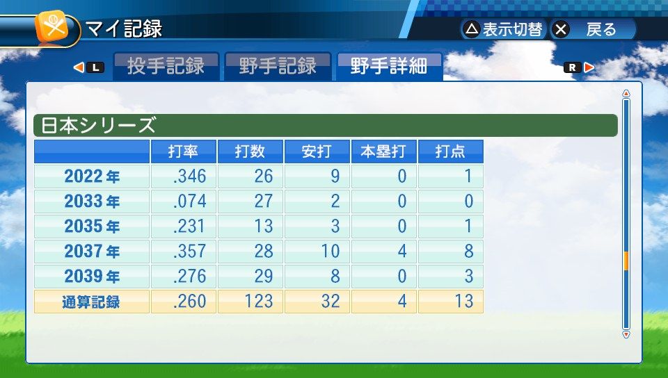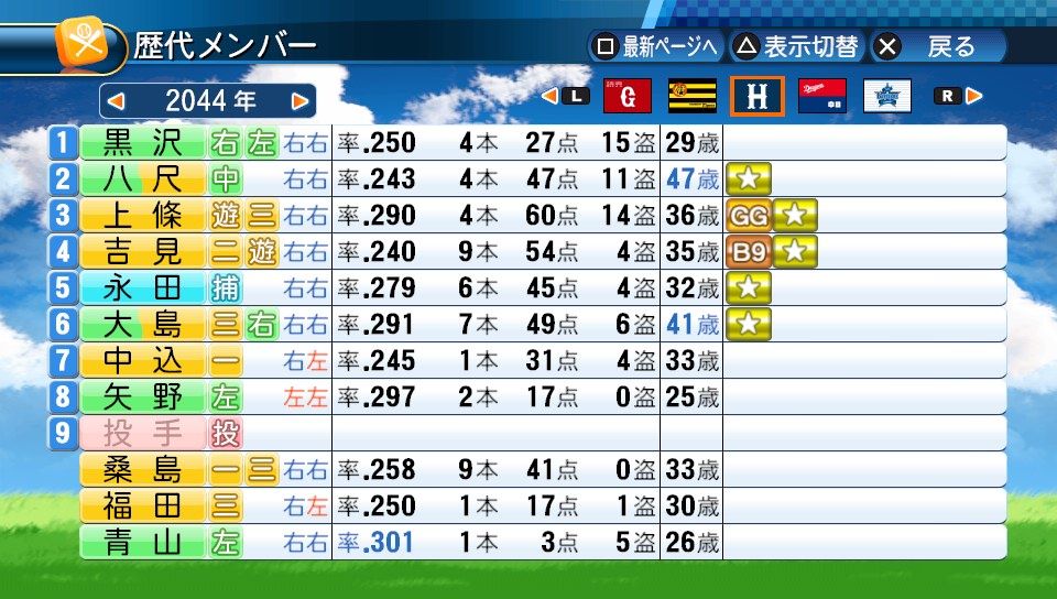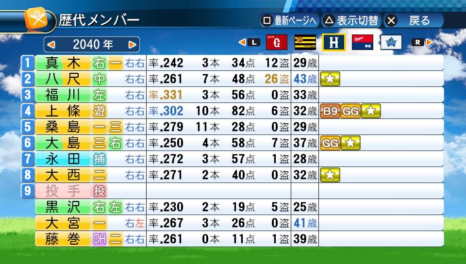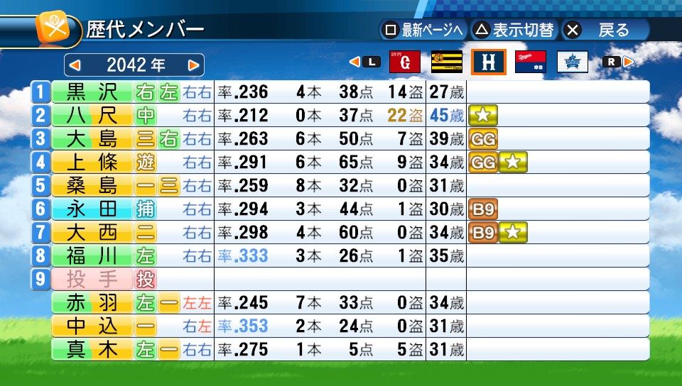 弾3FEBFFF チャンスC ケガG 盗塁F 走塁C 送球F 粘り打ち 内野安打○ 満塁男 秋男