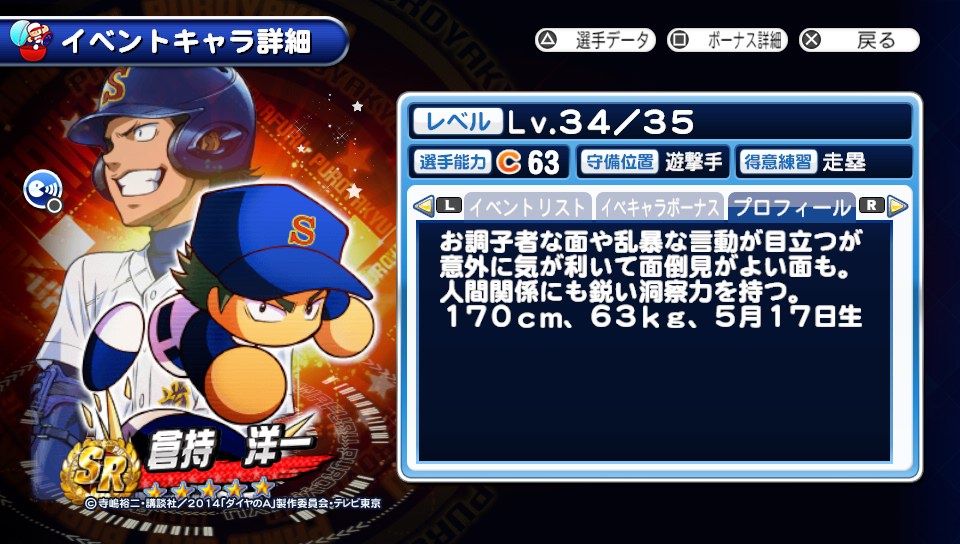 弾2EEADCC 対左C ケガC 盗塁A 走塁B 送球B バント○ 固め打ち 内野安打○ 初球○ チャンスメーカー 満塁男 サヨナラ男 ヘッスラ 守備職人