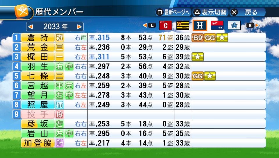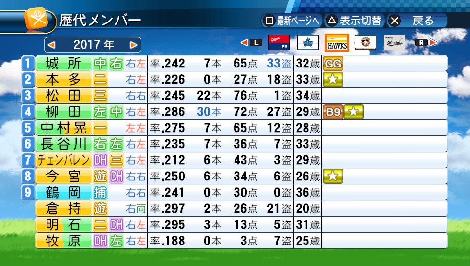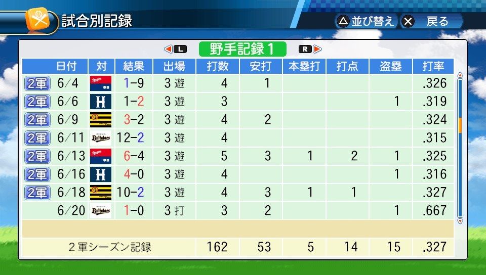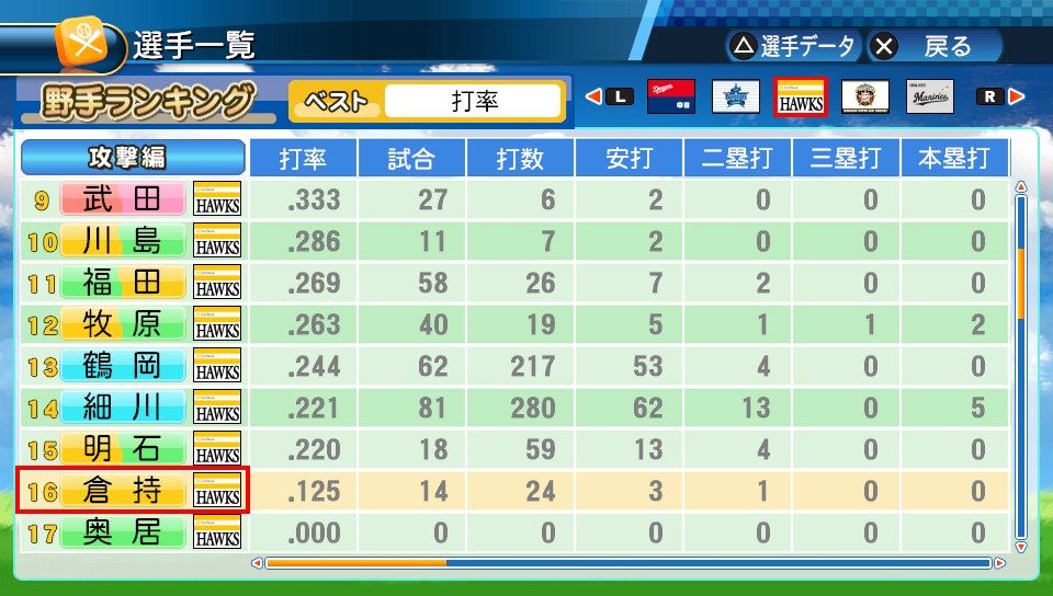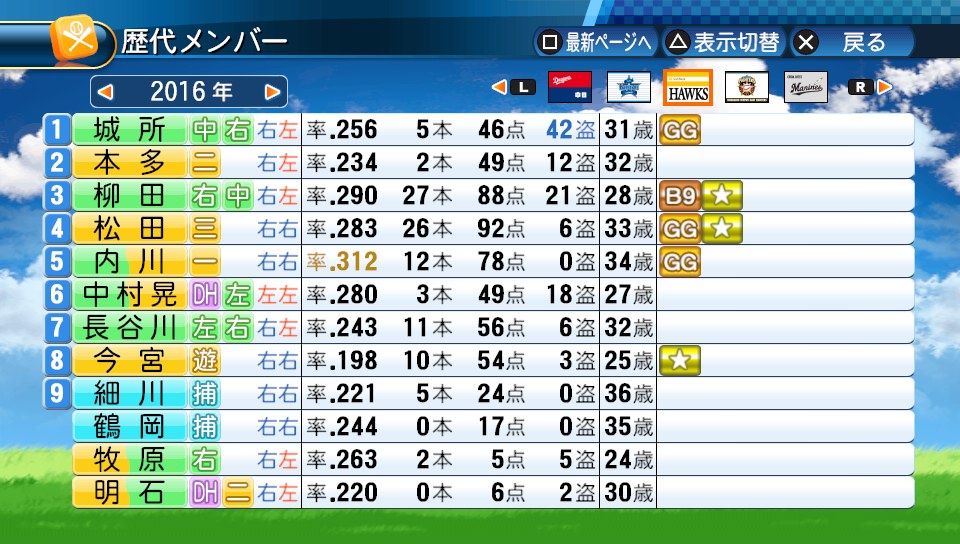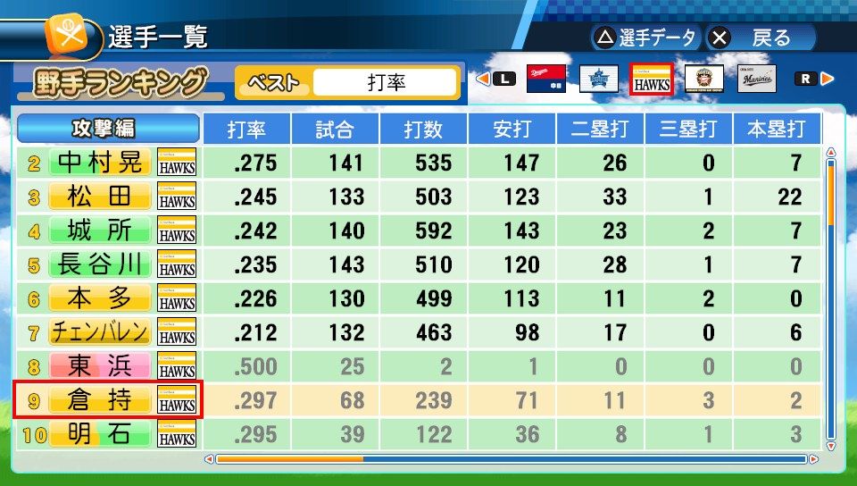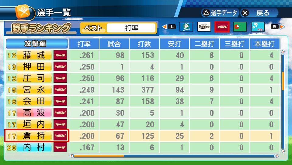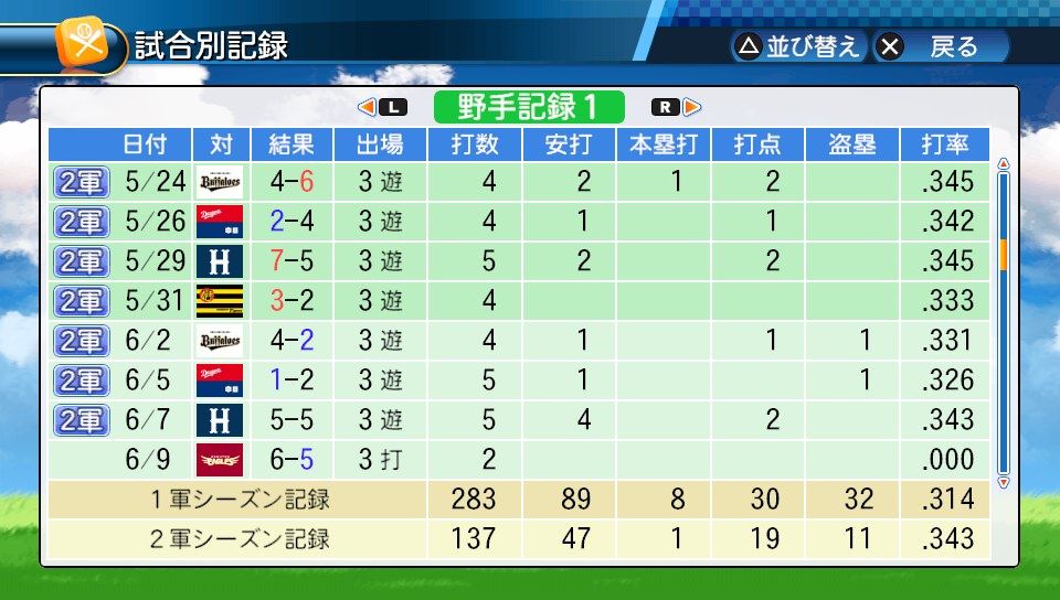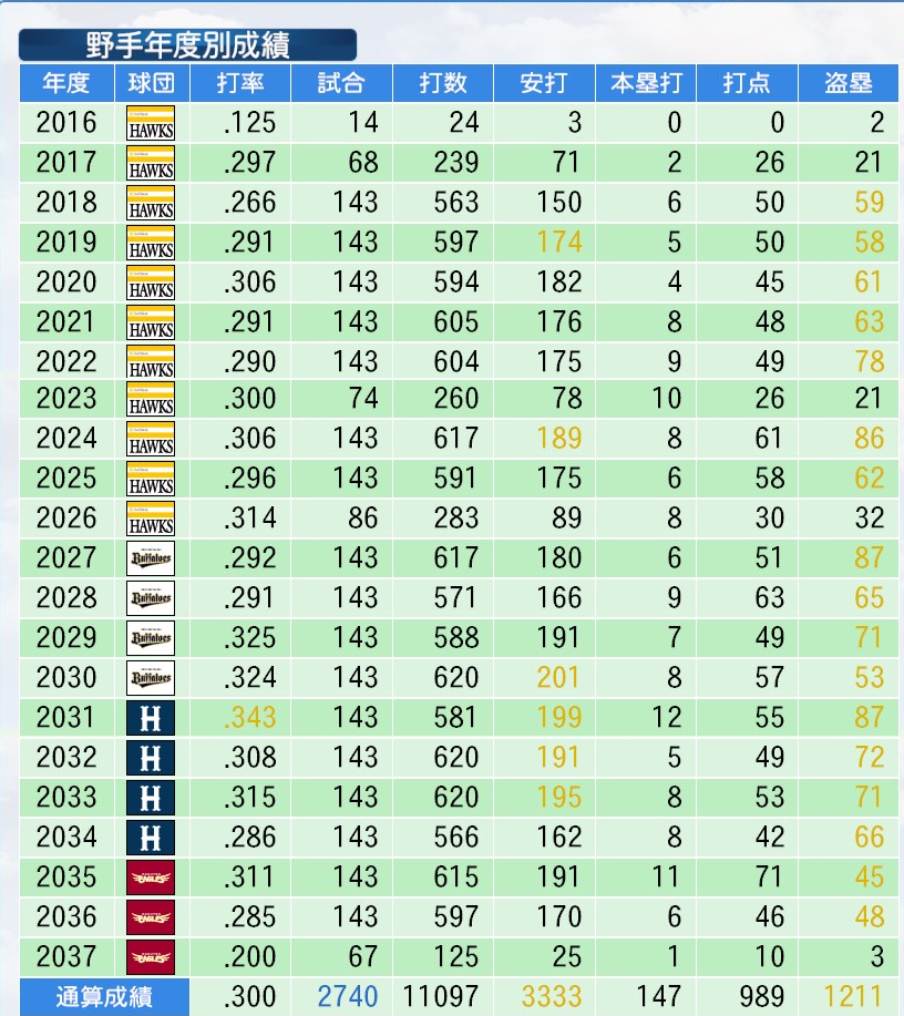 弾2DEADBC 対左B ケガC 盗塁A 走塁C 送球B バント○ 内野安打○ 固め打ち チャンスメーカー 三振 満塁男 サヨナラ男 ヘッスラ 守備職人