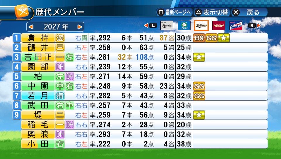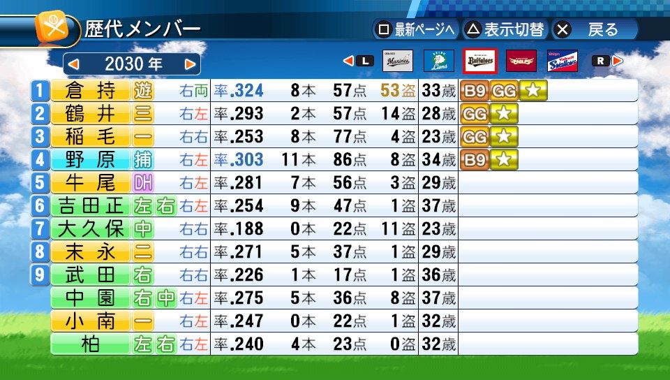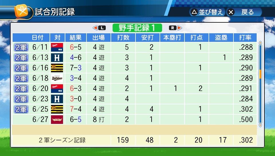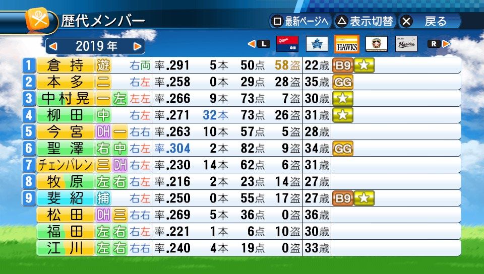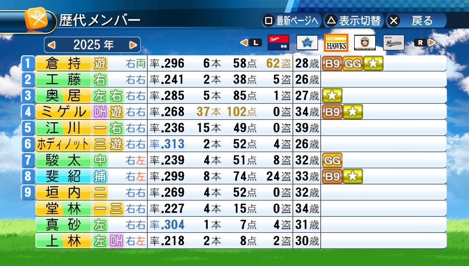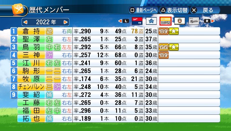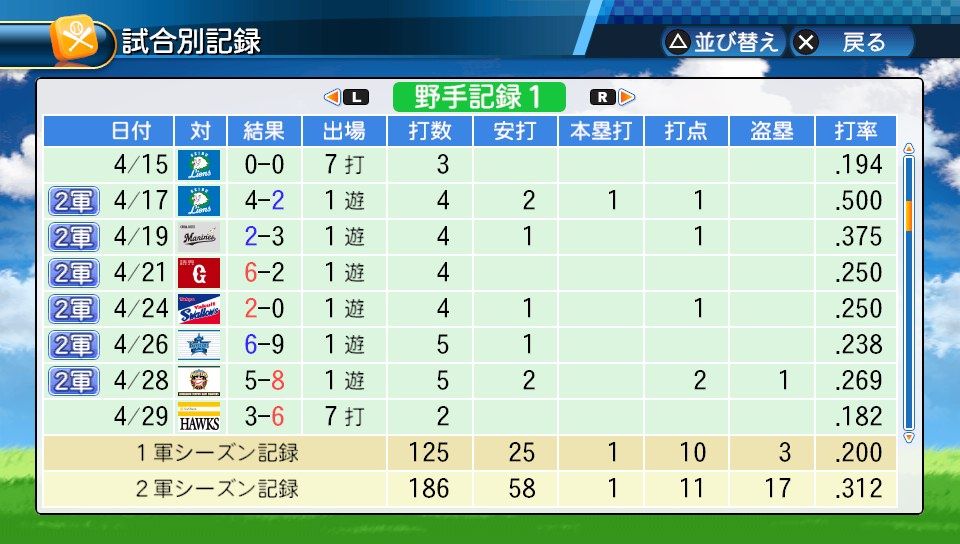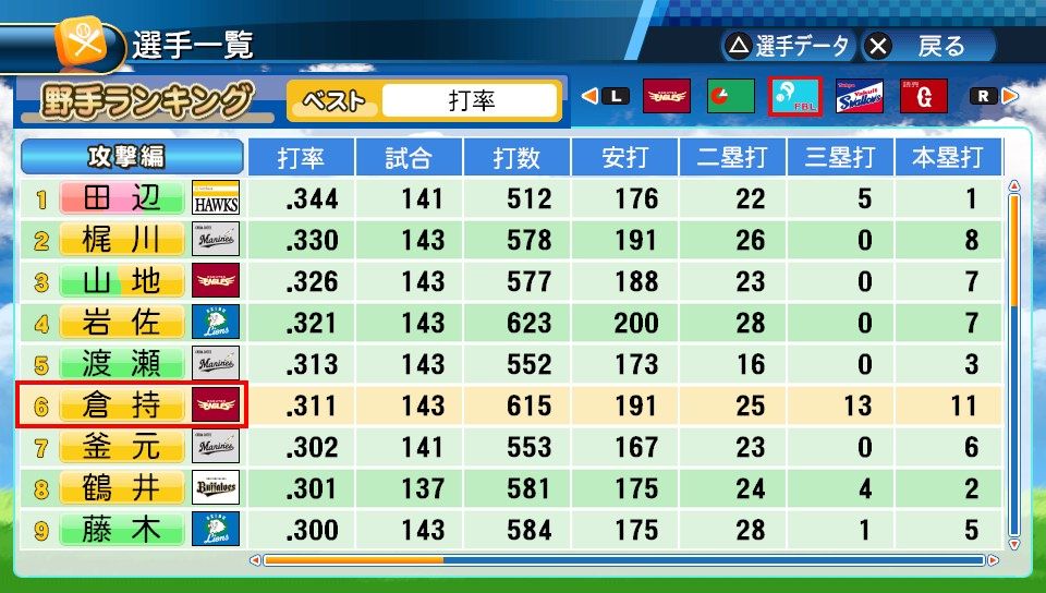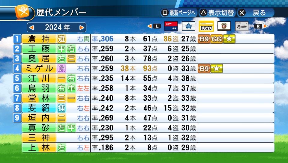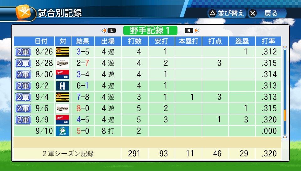 弾2DEADBC 対左B ケガC 盗塁A 走塁C 送球B バント○ 内野安打○ 固め打ち チャンスメーカー 三振 満塁男 サヨナラ男 ヘッスラ 守備職人