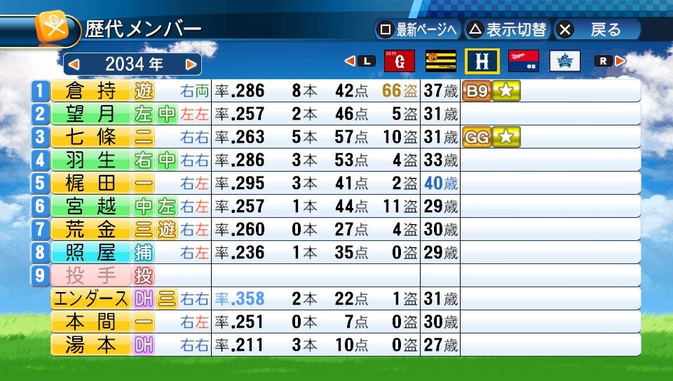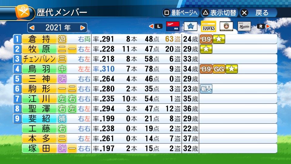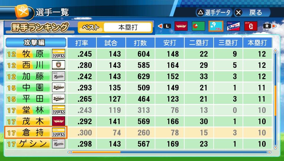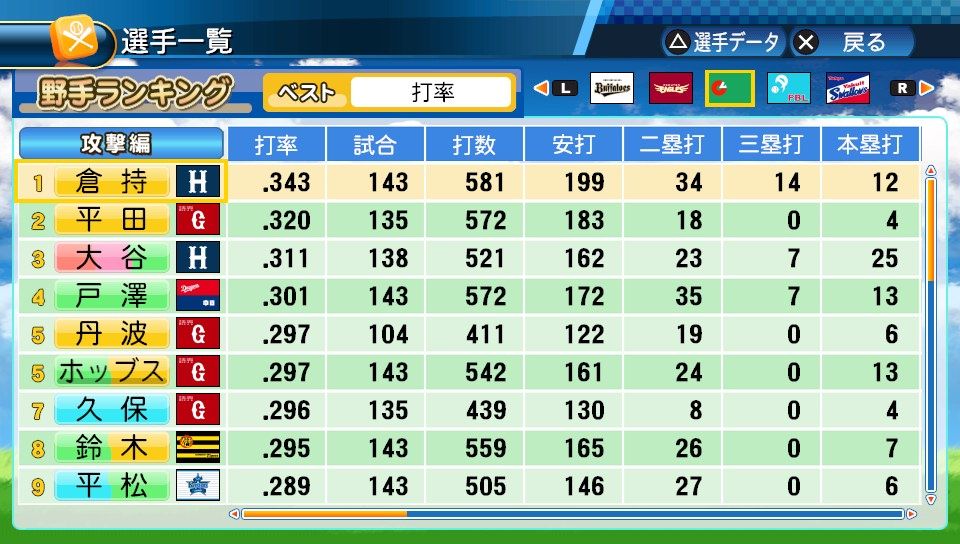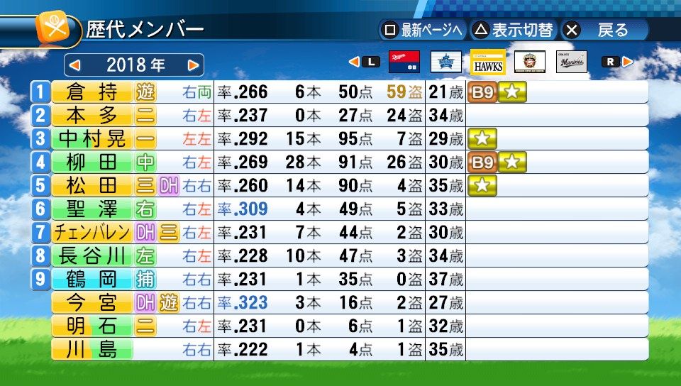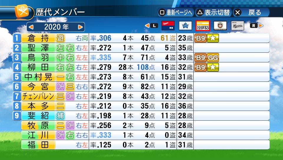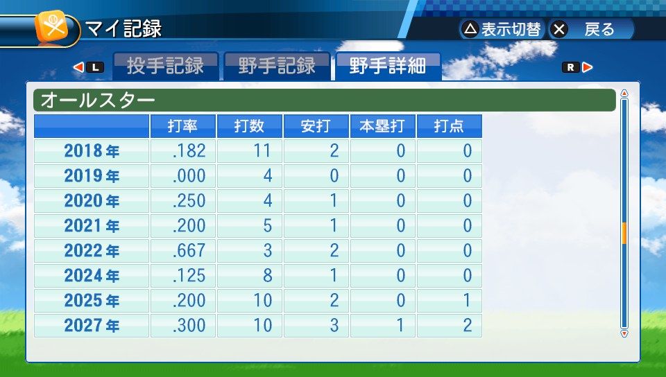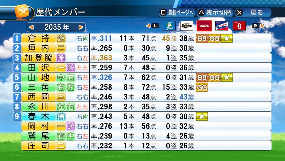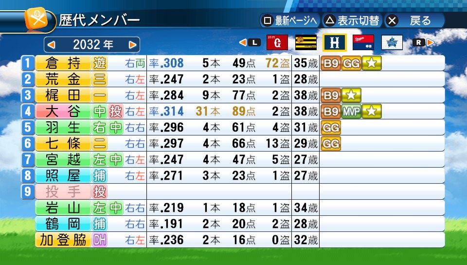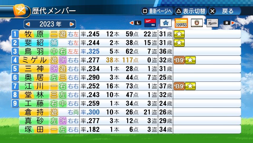 弾2DEADBC 対左B ケガC 盗塁A 走塁C 送球B バント○ 内野安打○ 固め打ち チャンスメーカー 三振 満塁男 サヨナラ男 ヘッスラ 守備職人