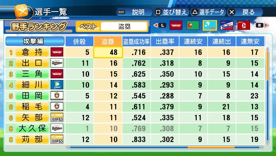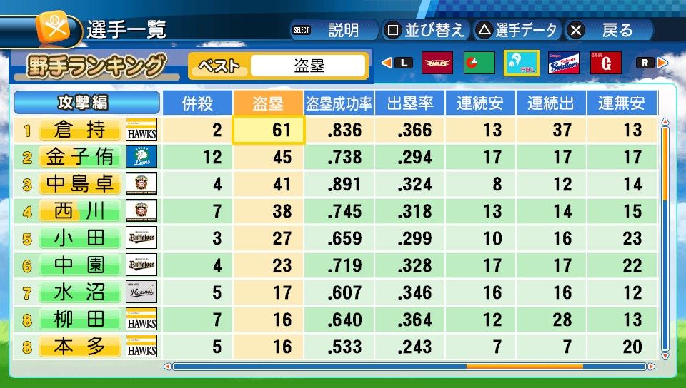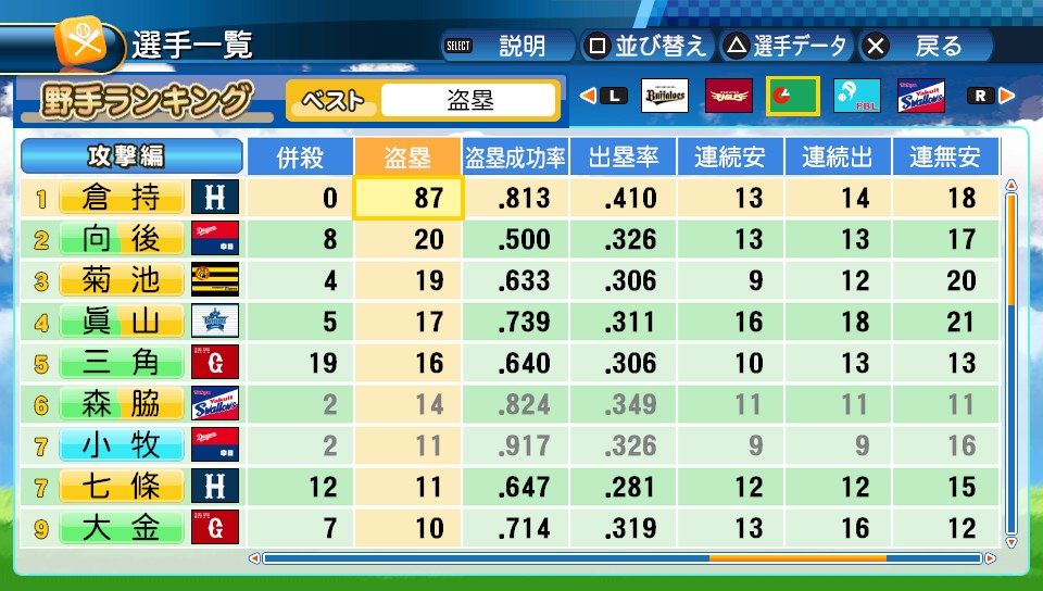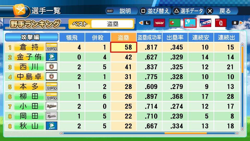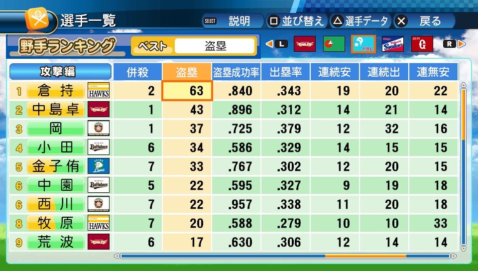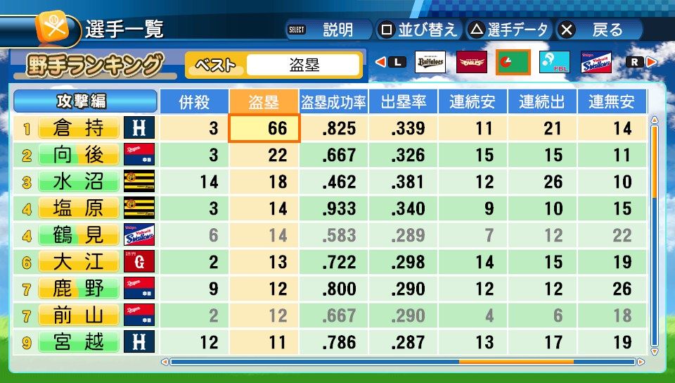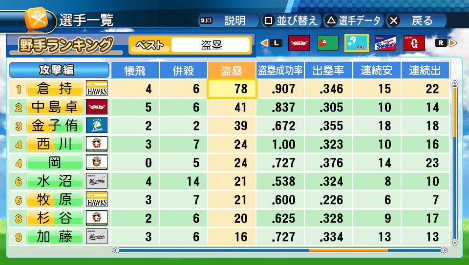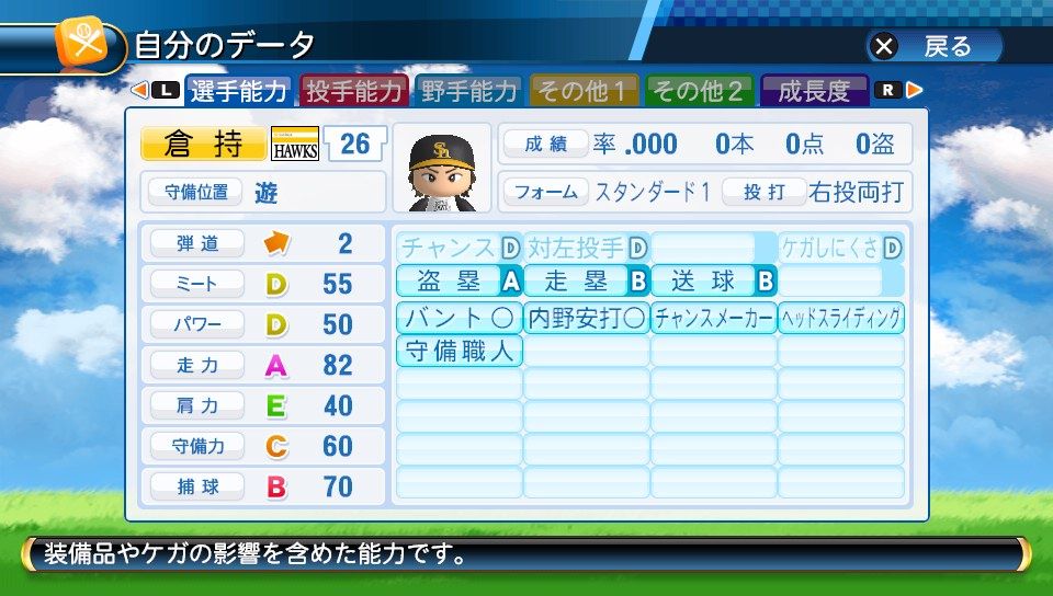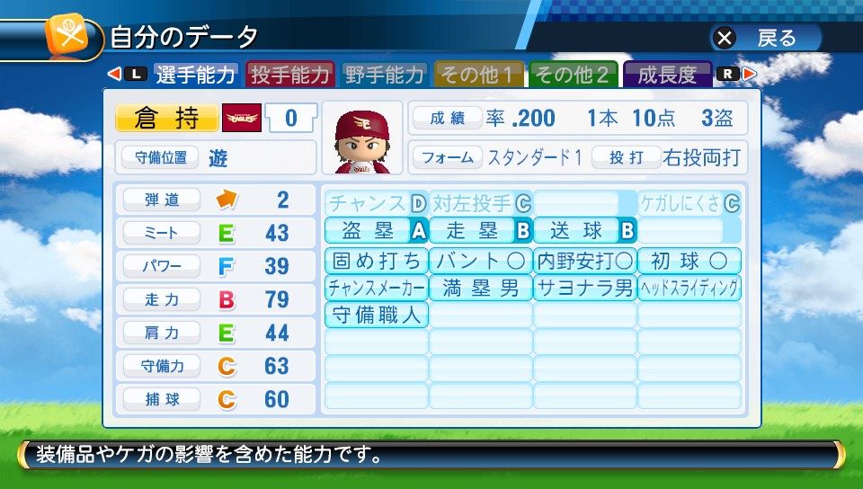 弾2DDSECB 盗塁A 走塁C 送球B バント○ 内野安打○ チャンスメーカー ヘッスラ 守備職人