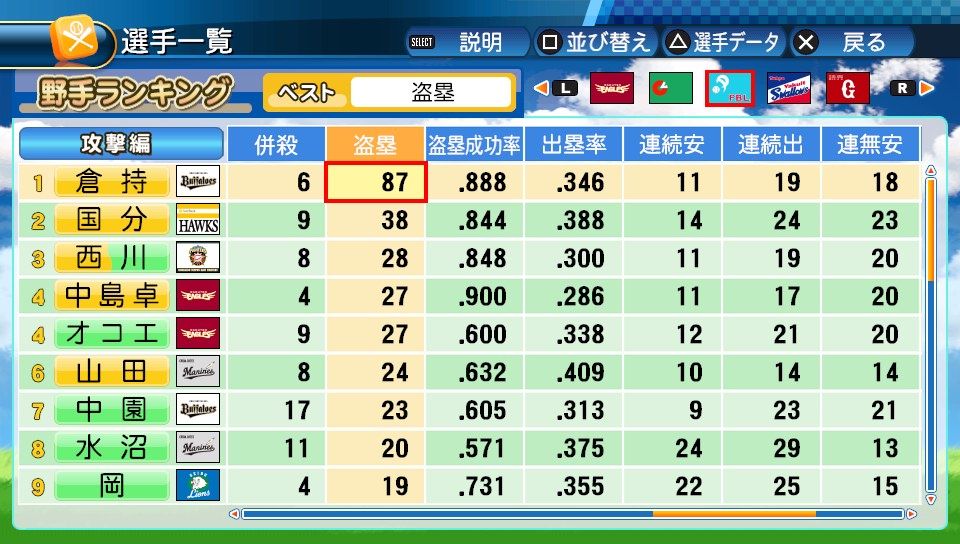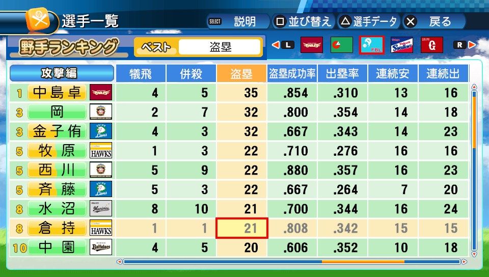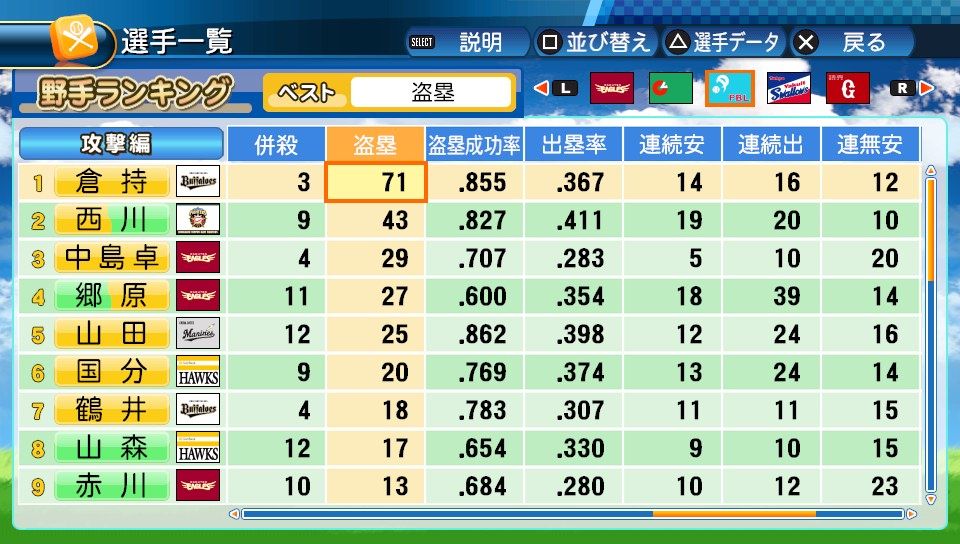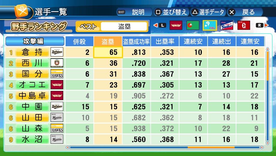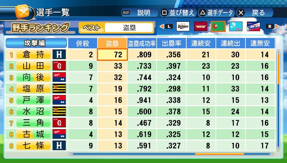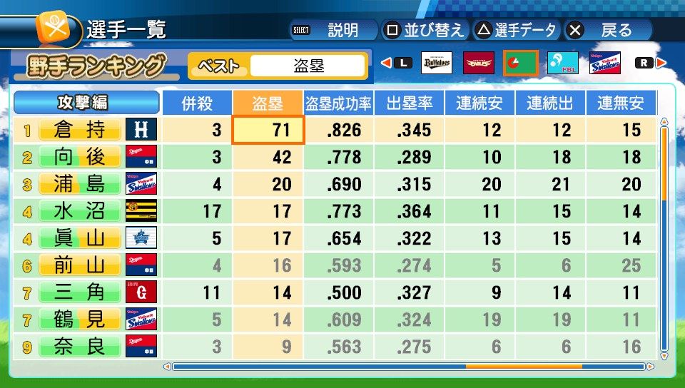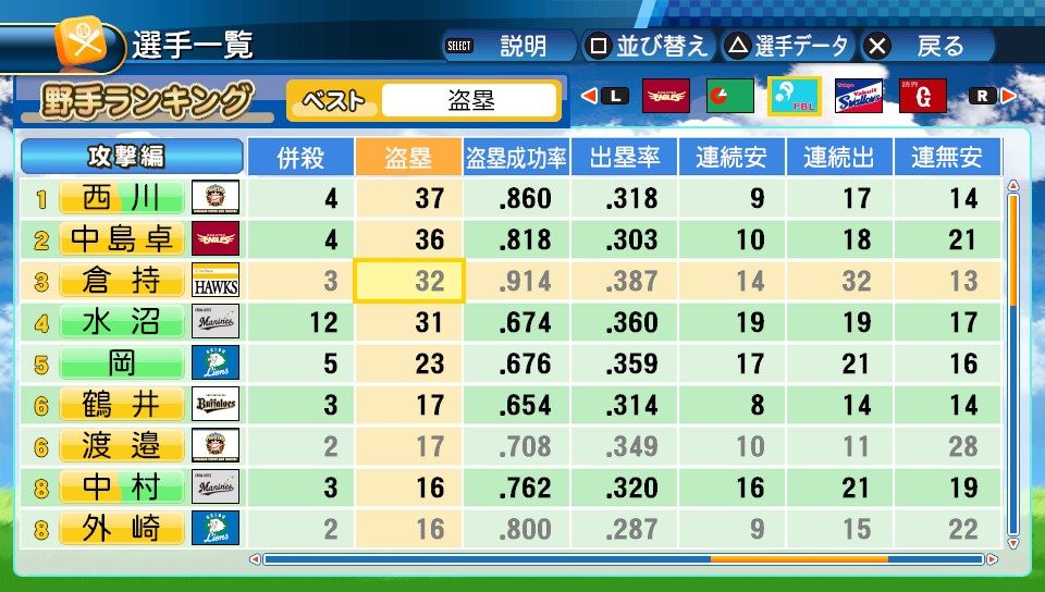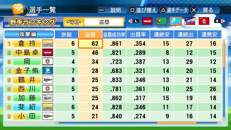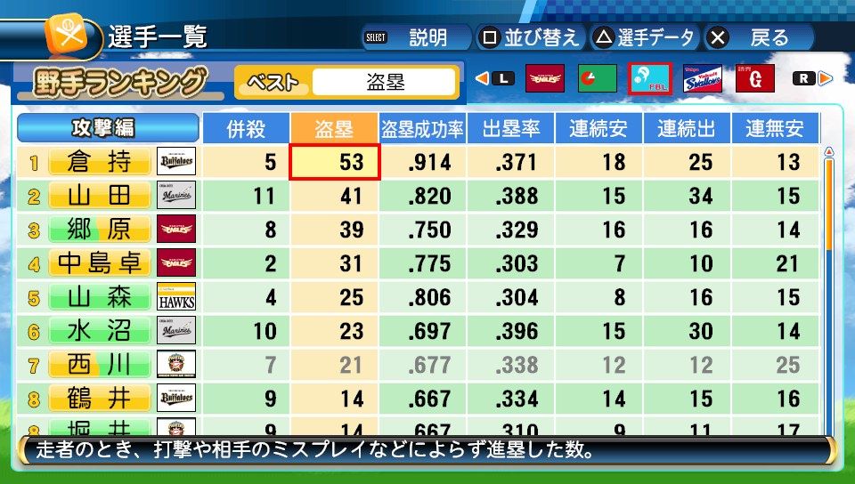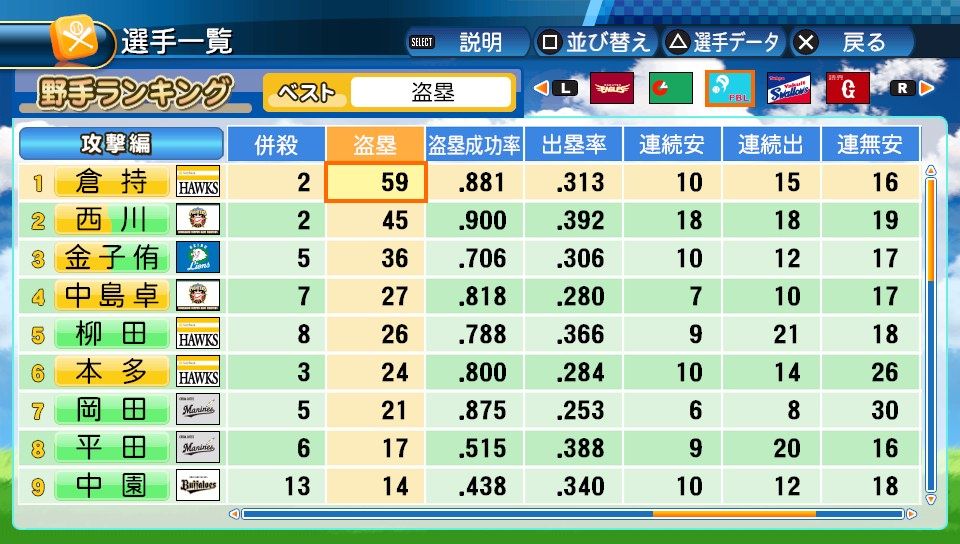 弾2DDSECB 盗塁A 走塁C 送球B バント○ 内野安打○ チャンスメーカー ヘッスラ 守備職人