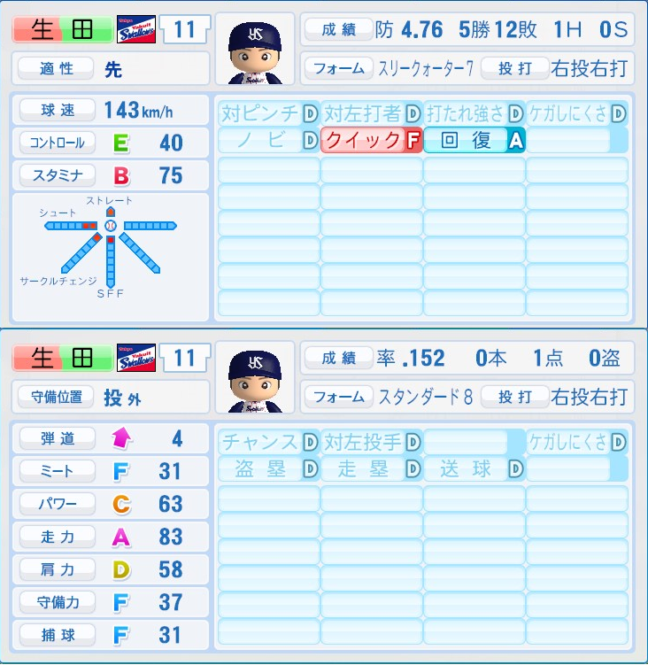弾2DEADBB 対左B ケガC 盗塁A 走塁C 送球B バント○ 内野安打○ チャンスメーカー 三振 ヘッスラ 守備職人