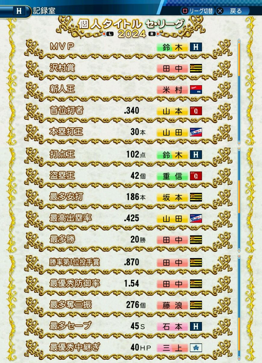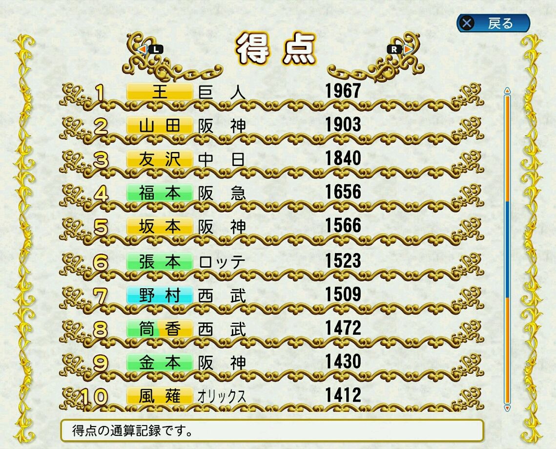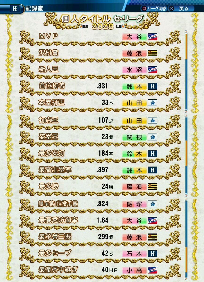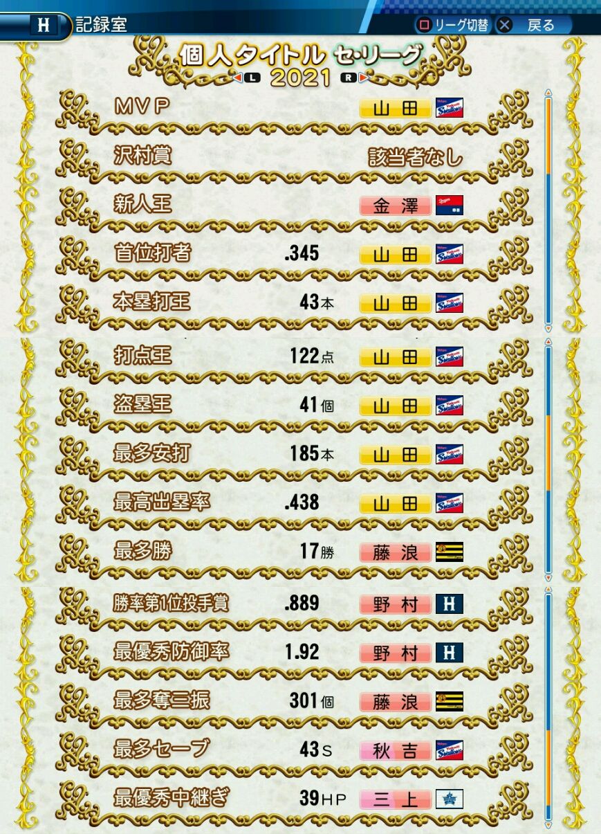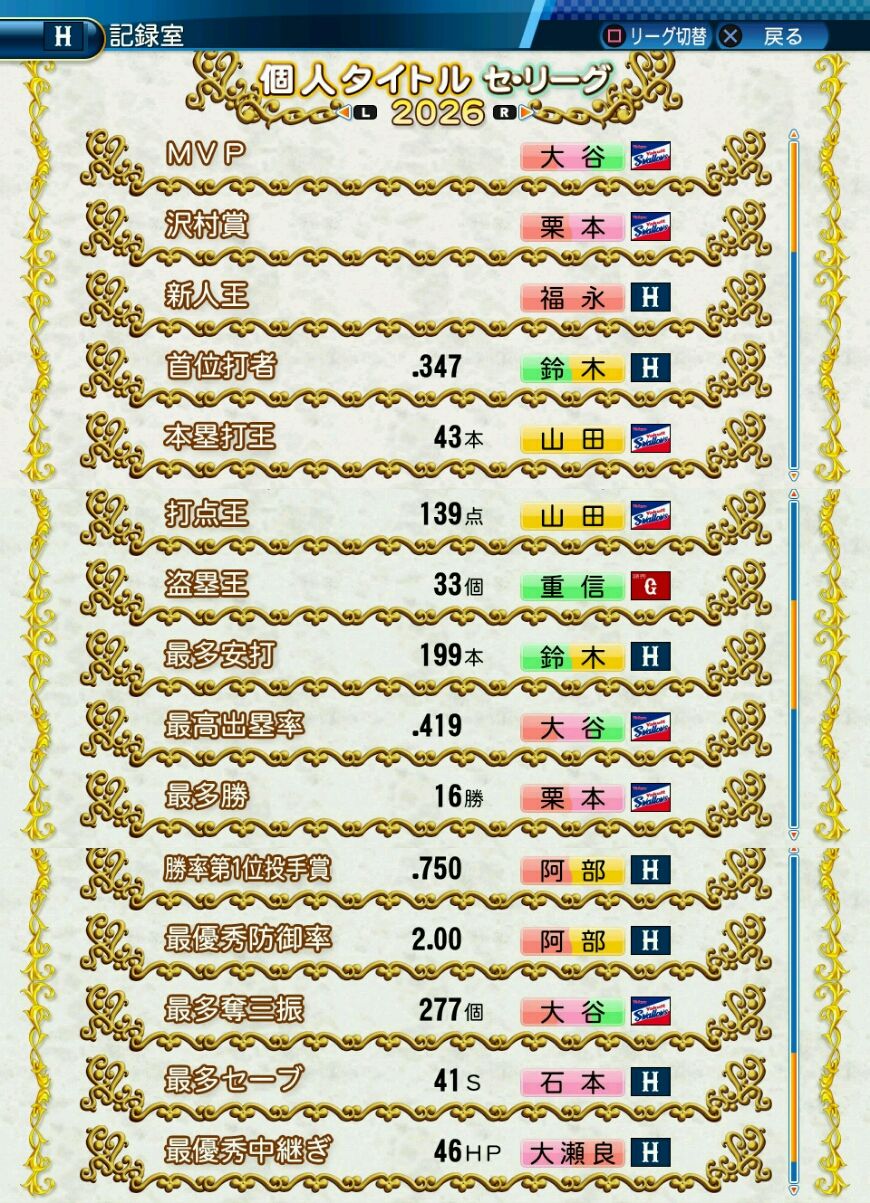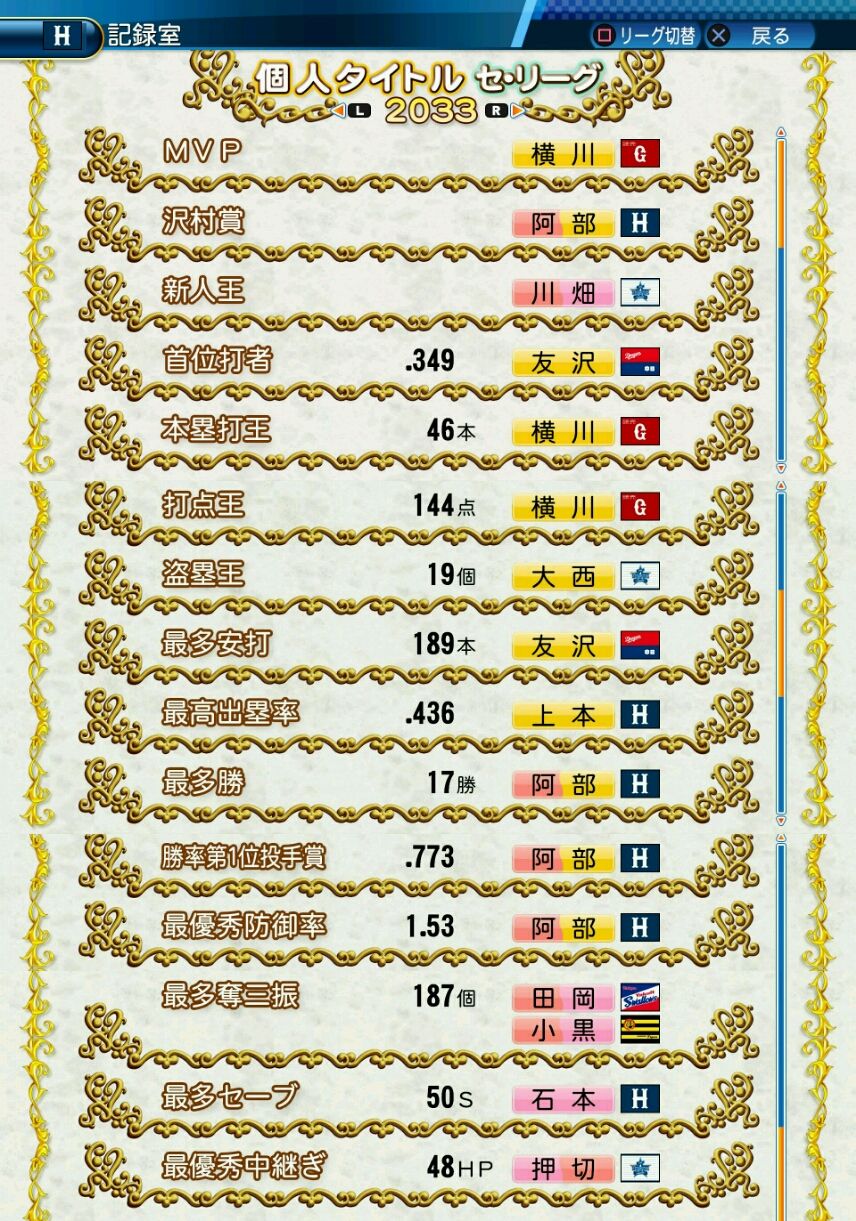 タイトルなしだから引き分け!wもそうだけど、所属チーム違うと打点だとかチーム事情によるレギュラーの取りやすさとか色々と条件が違くなるんだからこのシリーズの致命的な部分だよなあ