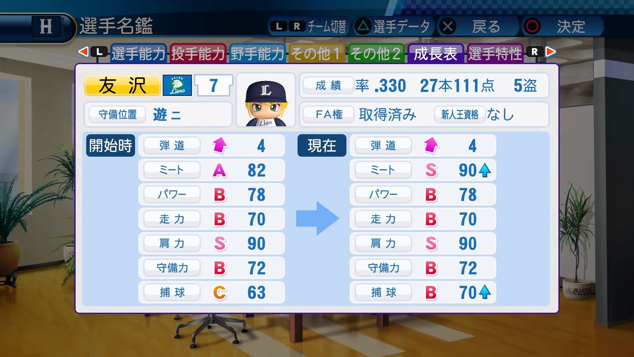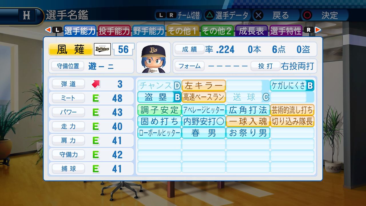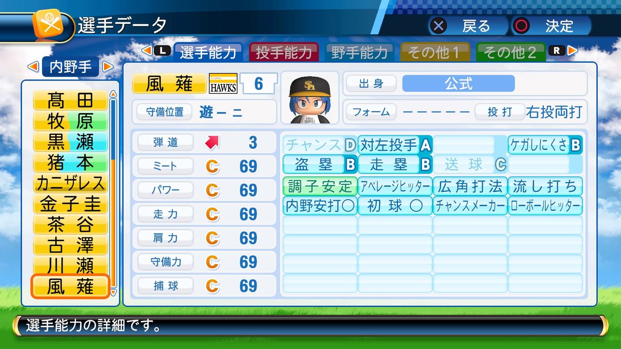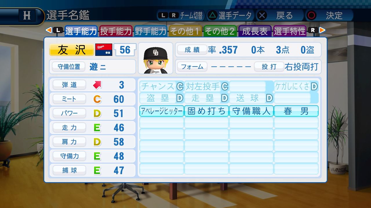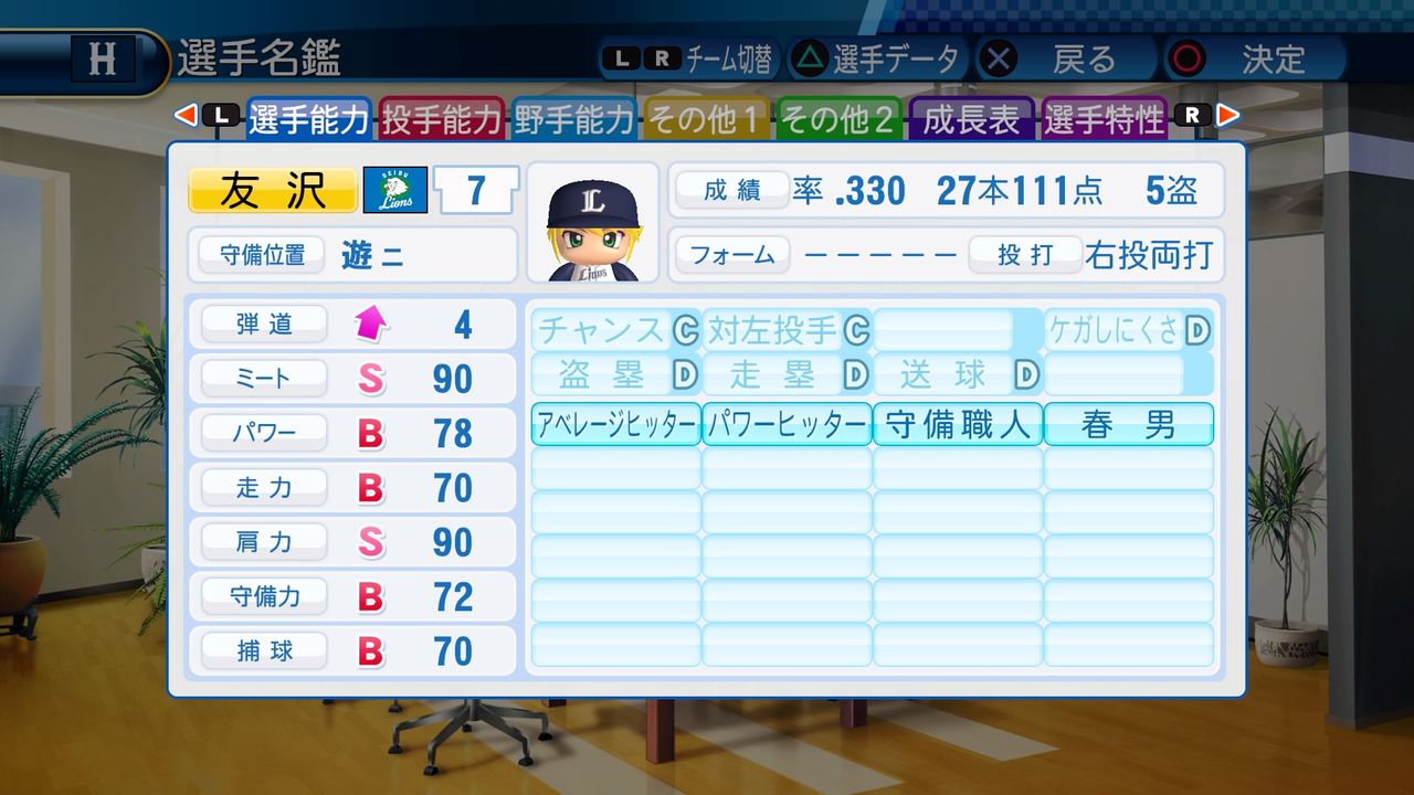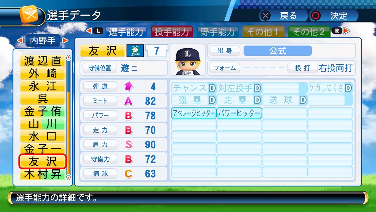 対左投手A ケガしにくさB 盗塁B 走塁B 送球C 調子安定 アベレージヒッター 広角打法 流し打ち
