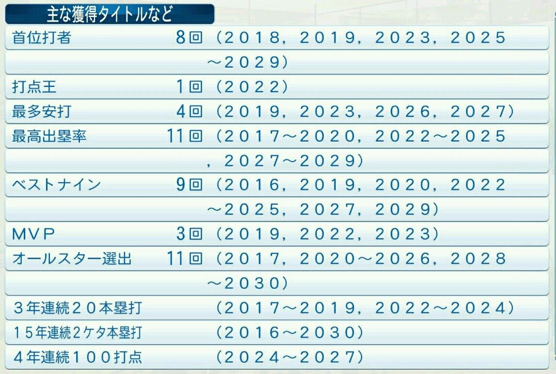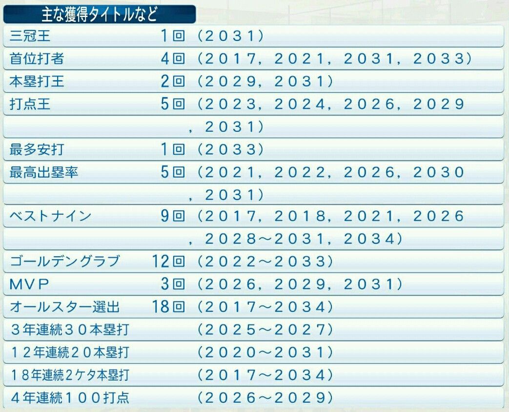 本塁打王 2回(2029、2031)