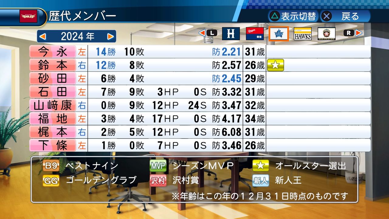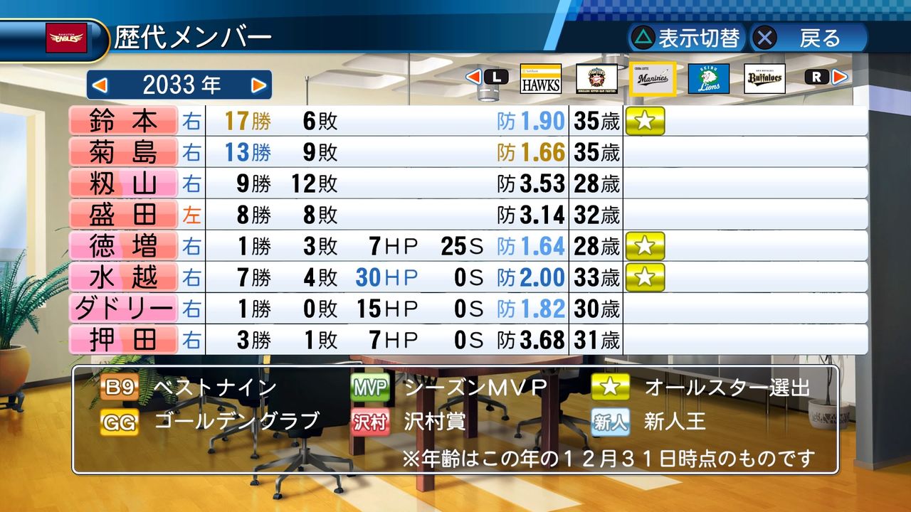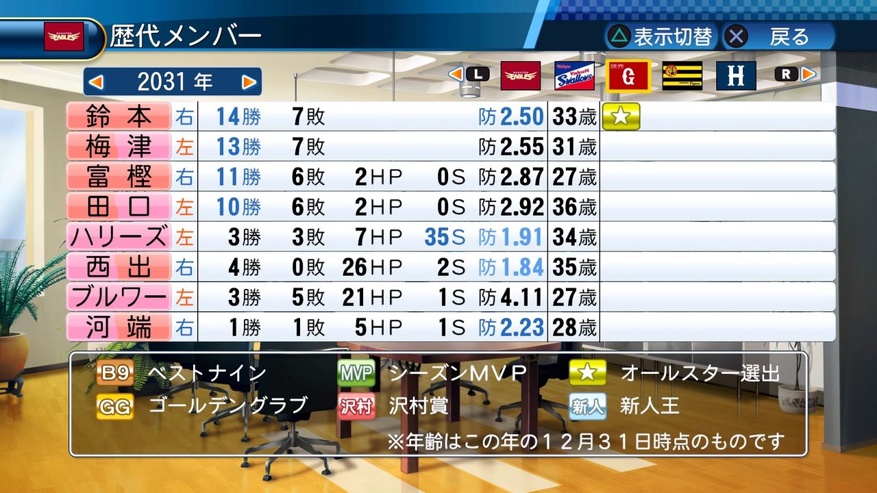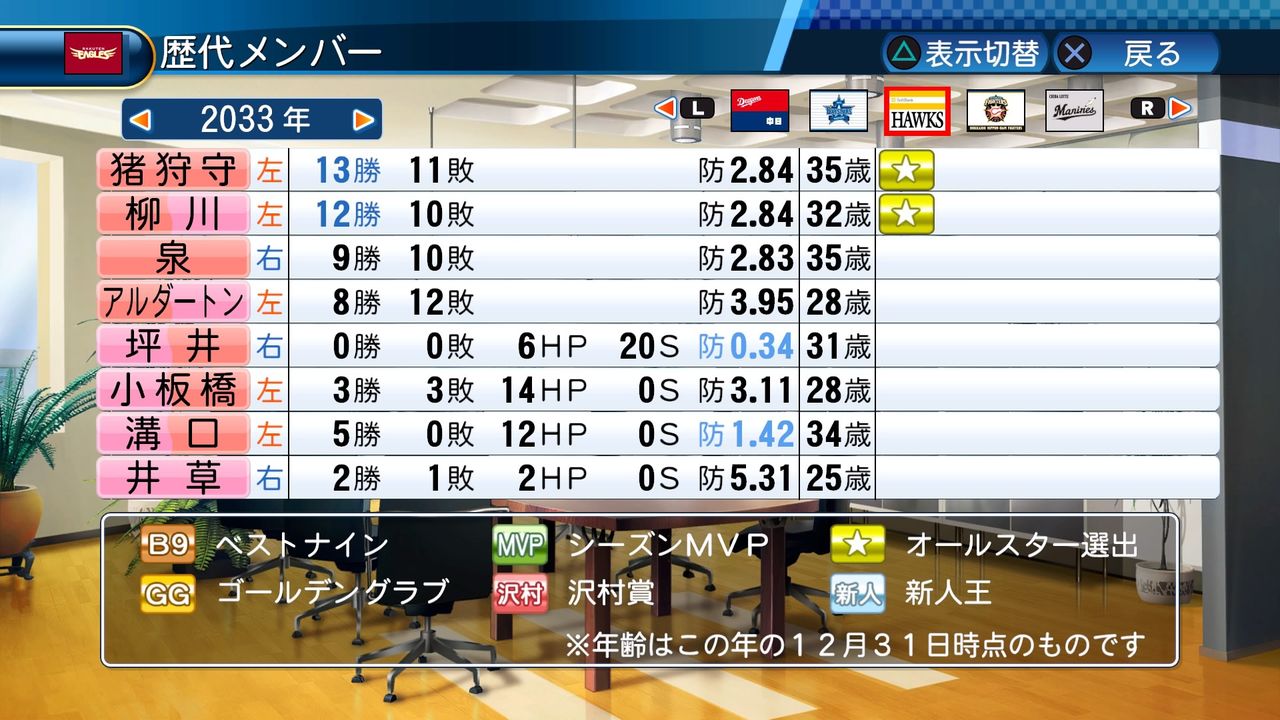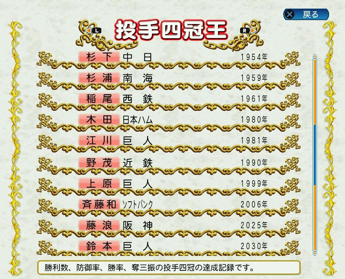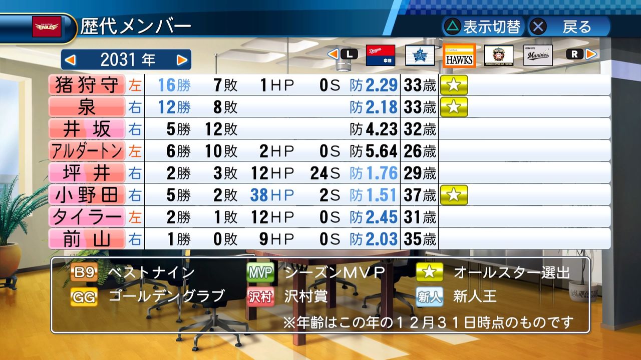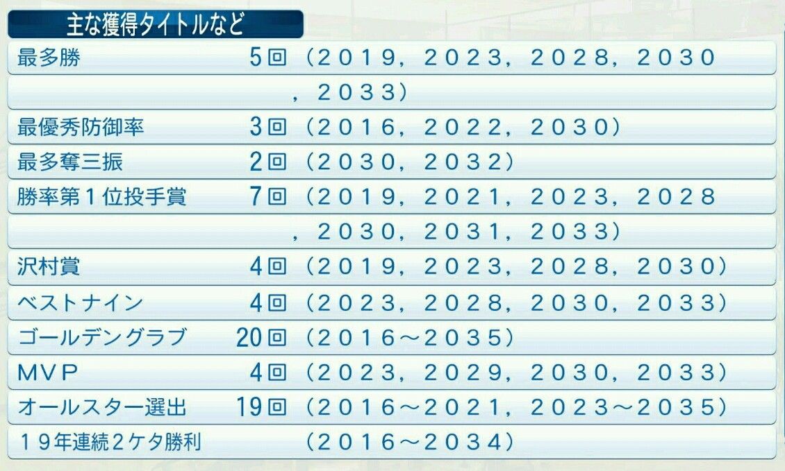 勝率1位投手 7回(2019、2021、2023、2028、2030、2031、2033)