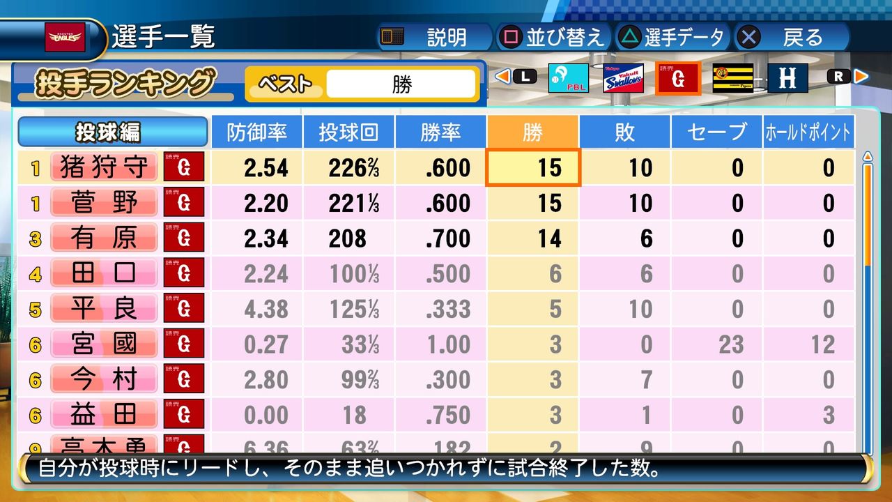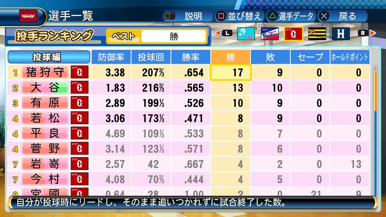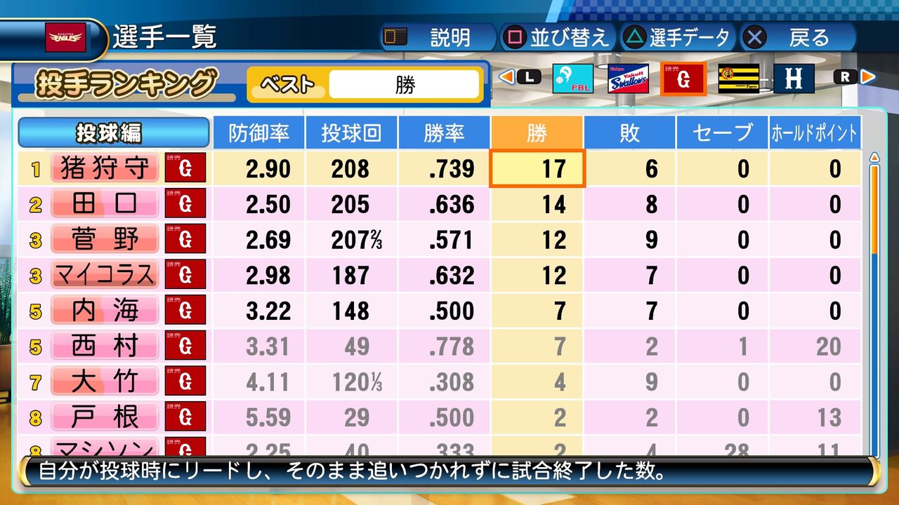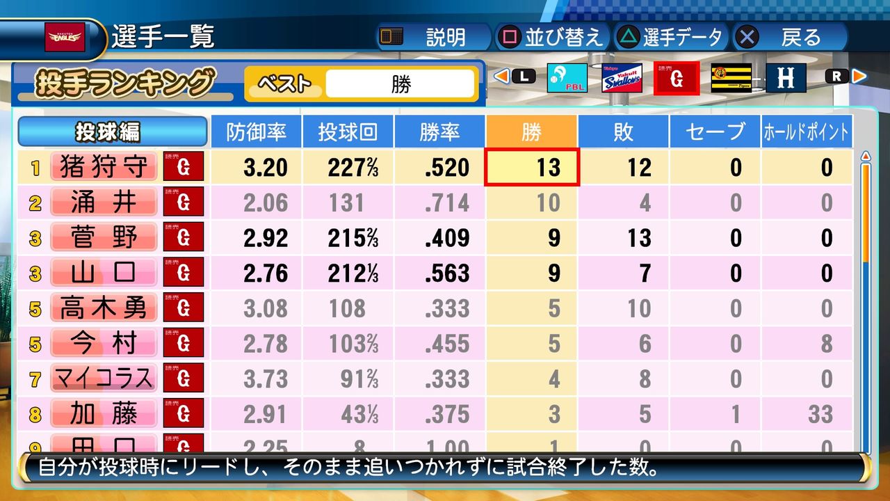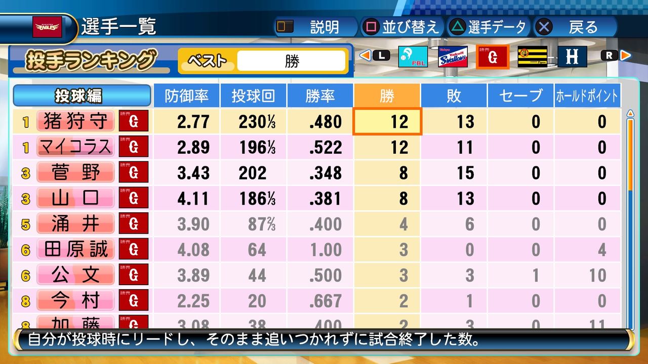 猪狩は防御率の割に勝ち星に恵まれず、菅野選手と共に不遇なエースとなった。