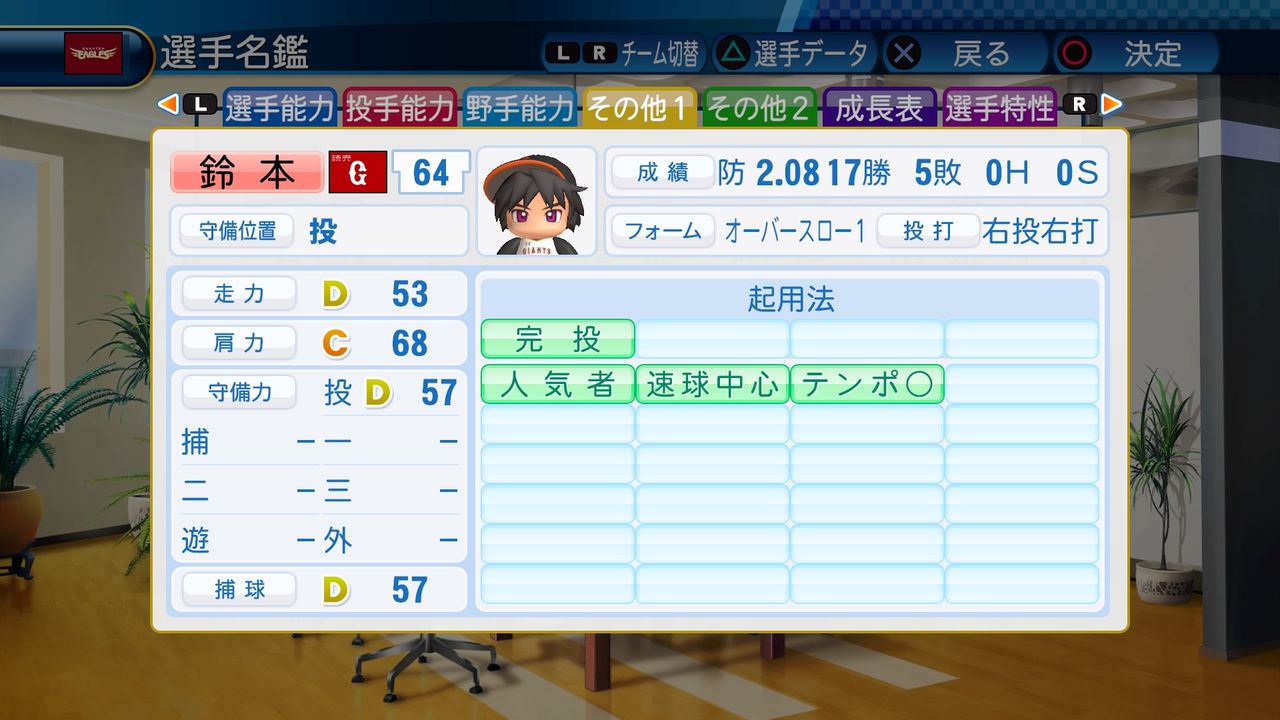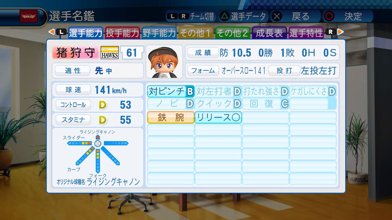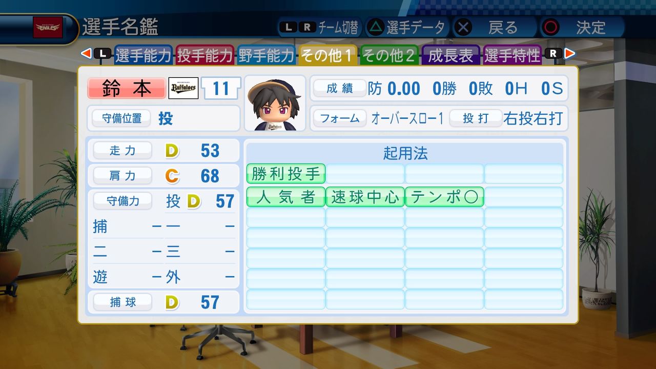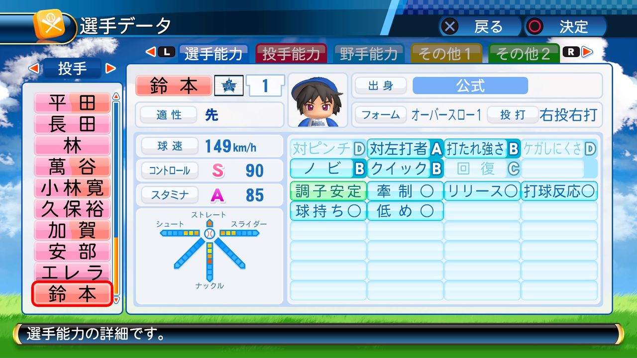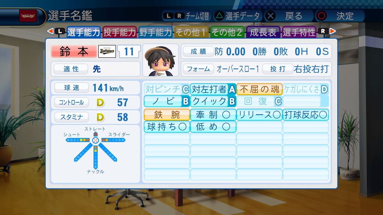 対左打者A 打たれ強さB ノビB クイックB 回復C 調子安定 牽制○ リリース○ 打球反応○