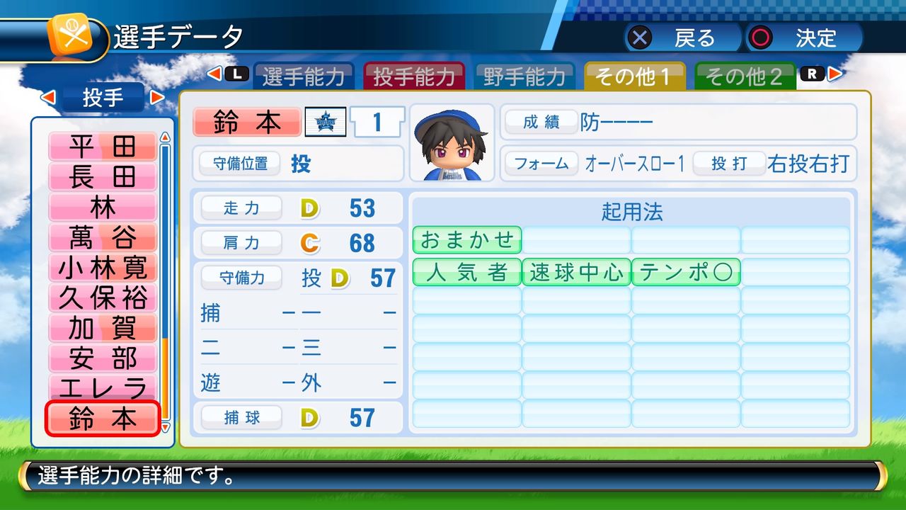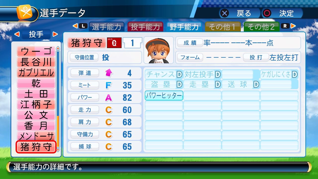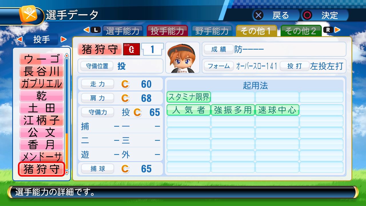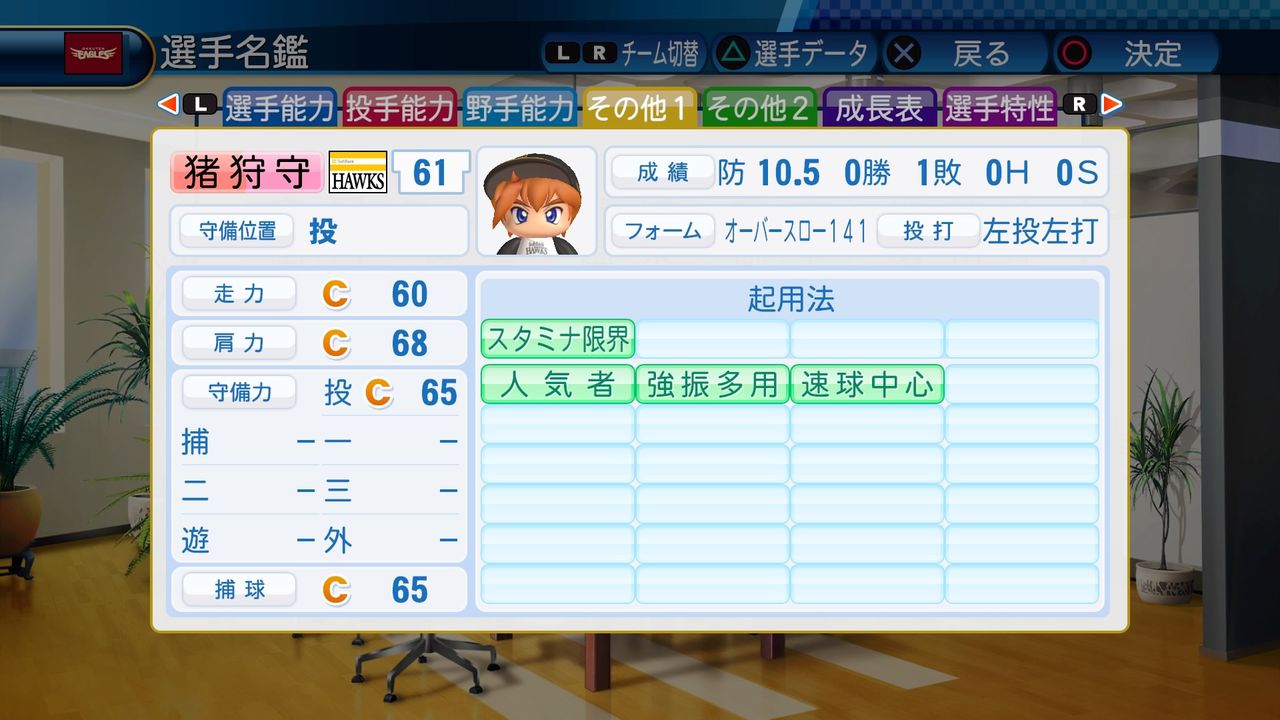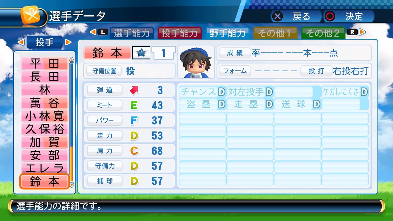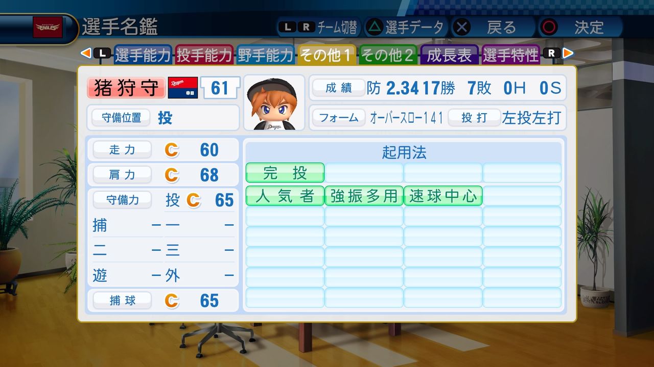 対左打者A 打たれ強さB ノビB クイックB 回復C 調子安定 牽制○ リリース○ 打球反応○