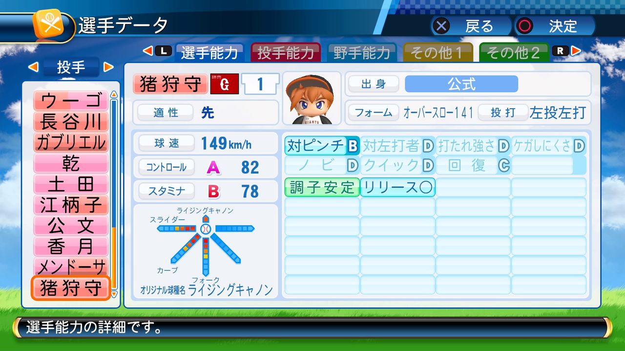 球速149km/h コンA82 スタB79 ライジングキャノン スライダー4 カーブ4 フォーク4