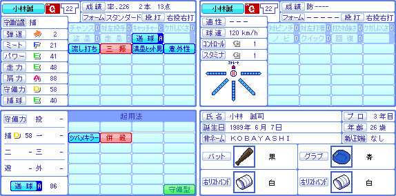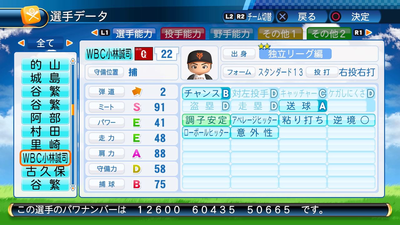 キャッチャー○、意外性、アベレージヒッター、ムード○、チャンスメーカー、チャンス◎、積極打法、積極守備、人気者、調子安定、送球○