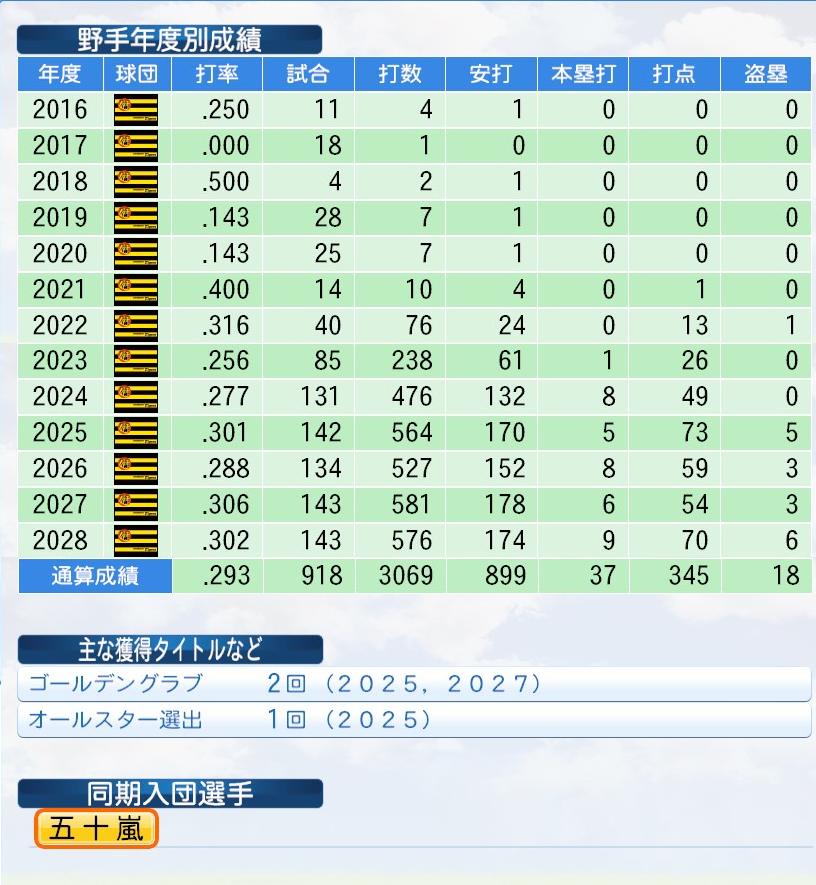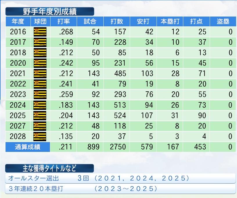 得点圏.191 三振164 四球51 死球3 犠打0 犠飛3 併殺15 出塁率.290 長打率.408 OPS.698
