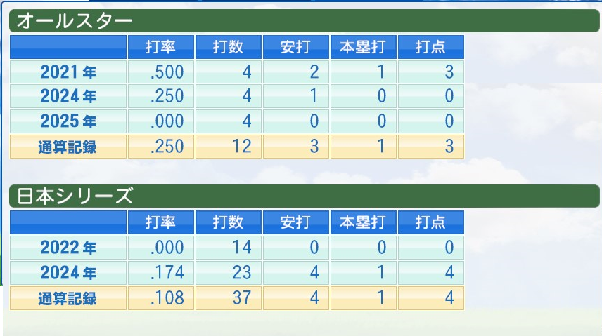 得点圏.000 三振11 四球5 死球0 犠打0 犠飛0 併殺0 出塁率.238 長打率.405 OPS.643