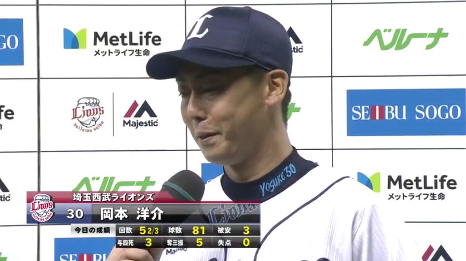 岡本洋介投手の談話の続きです。「自分の中で先発をきっちりやれないと終わってしまうと思っていました。 試合前に監督から”表情が怖いぞ”と言われました。2年ぶりの勝利は、大きい一勝だと思います」