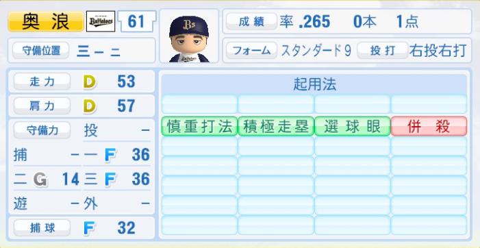 アプデ後奥浪 3FDDDFF 送球E 三振 併殺 慎重打法 選球眼 積極走塁←new!