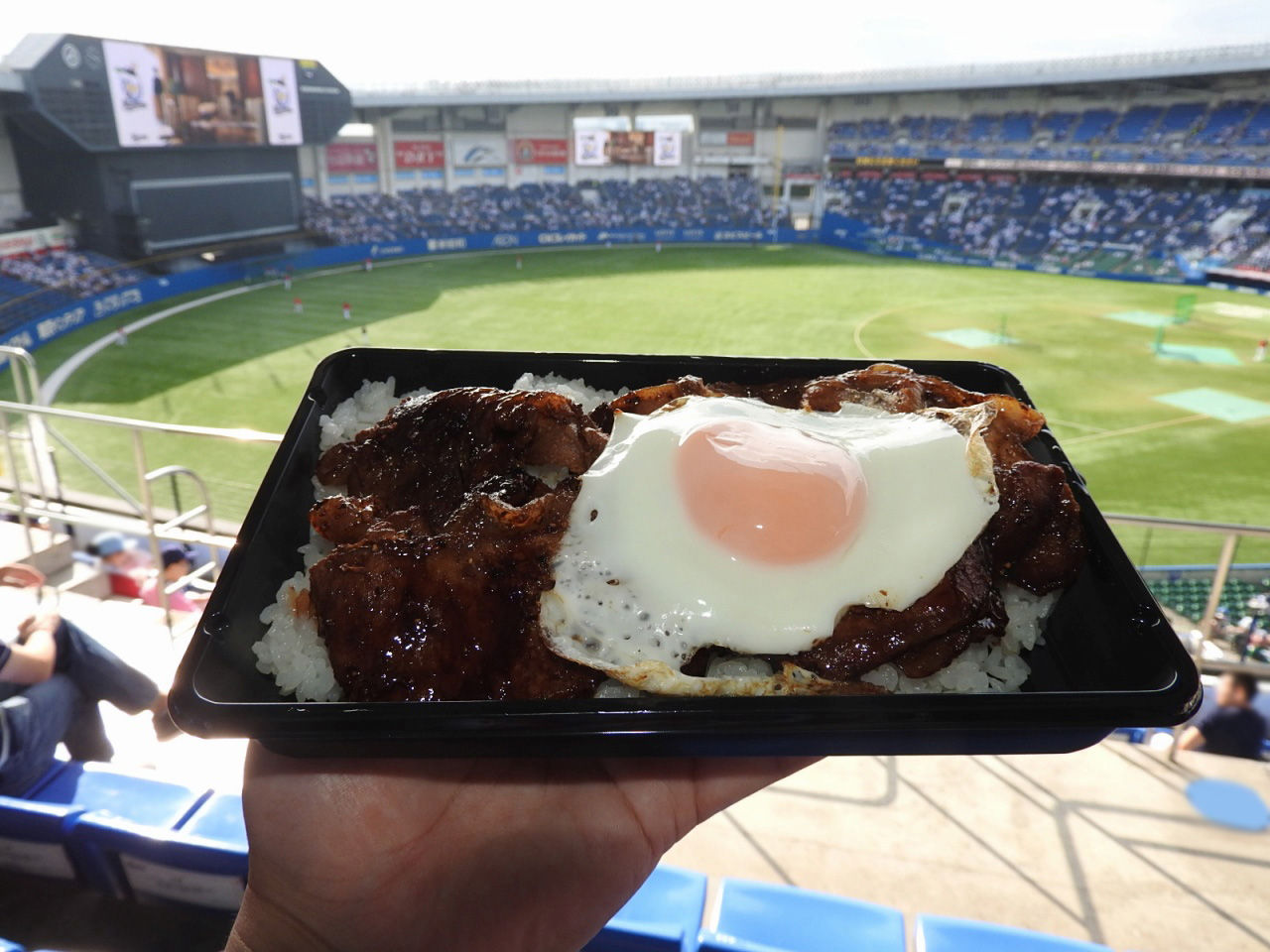 球場外のグルメワゴン、北海道うまいものグルメの豚玉丼。