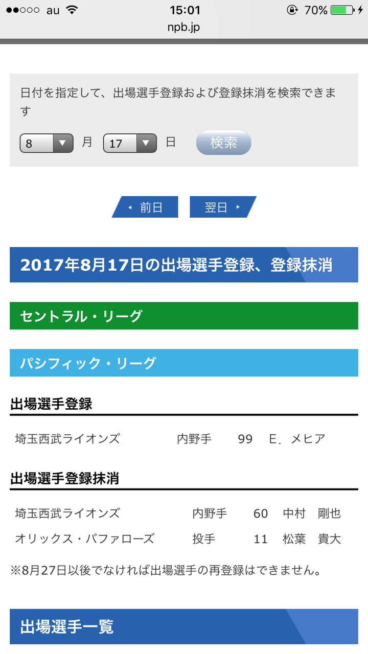 8/17(木)のパ・リーグ公示