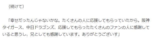 「幸せだったんじゃないかな。たくさんの人に応援してもらっていたから。阪神タイガース、中日ドラゴンズ、応援してもらったたくさんのファンの人に感謝していると思うし、兄としても感謝しています。ありがとうございす」