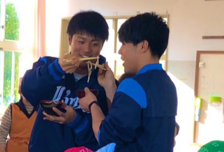 今日は #南郷春季キャンプ 初めてのオフ日です。ルーキー達は南郷小学校に訪れて、6年生の生徒たちと一緒に日南名物の「魚うどん」作りを体験中です!食べさせ合いっこしているのは、先日マグロを「あーん」し合っていた #松本航 投手と #山野辺翔 選手です!#seibulions #埼玉西武ライオンズ #野球795 pic.twitter.com/iQIX9TjnuU