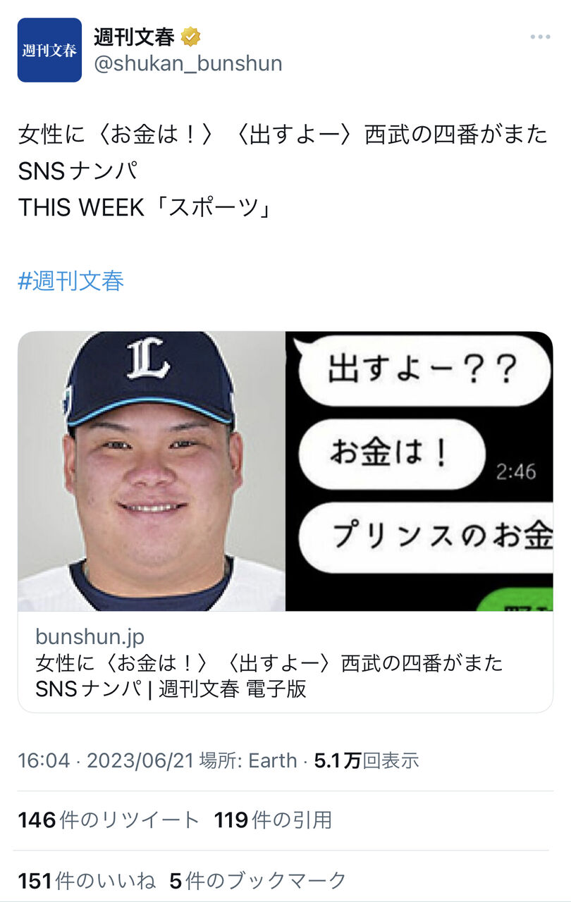女性に〈お金は!〉〈出すよー〉西武の四番がまたSNSナンパ